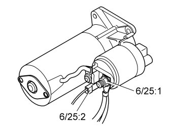 If the starter motor does not work when bridging between terminal #6/25:1(#B1) and terminal #6/25:2(#A1), despite being supplied with voltage from the battery, there is an internal fault.