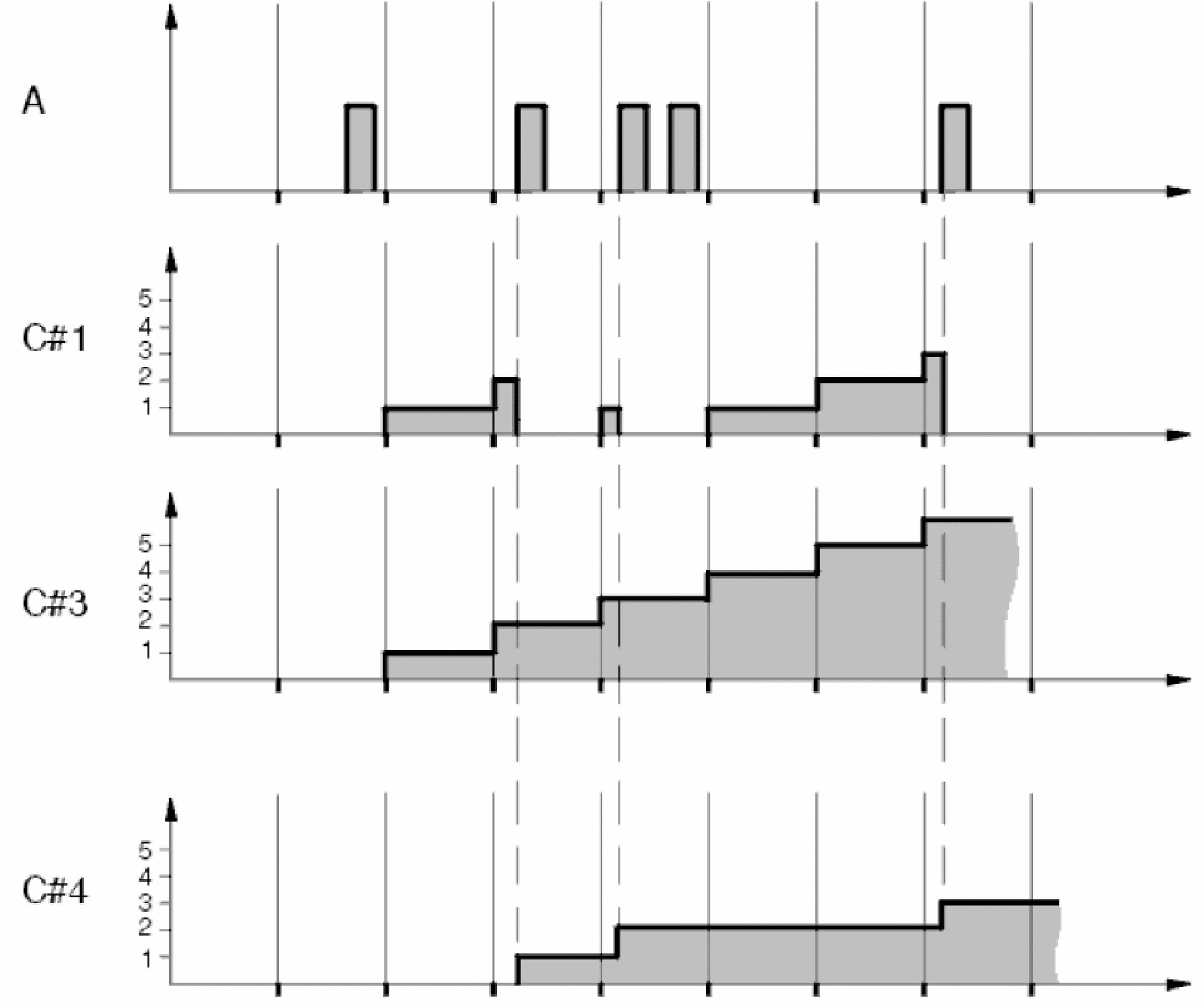 Counter 1 (C#1). Counts number of driving cycles performed since the malfunction was confirmed last. As soon as a malfunction is detected and confirmed, the value is reset. When the malfunction is both detected and disappears in the second driving cycle (graph A), counter 1 will count up to 1 first in the following driving cycle (driving cycle 3), that is, a driving cycle has been run through since the last time the malfunction was confirmed. In driving cycle 4, the counter is updated again, now to value 2. Just after that, the malfunction is detected (graph A), the malfunction is confirmed and the counter's value is reset. This sequence is repeated once again in driving cycle 5.