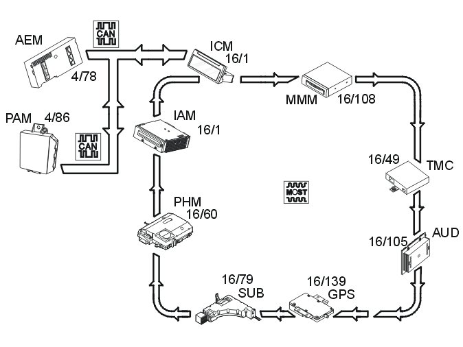 The integrated audio module (IAM) functions as a stereo system in the vehicle and is connected to other control modules on the MOST network.