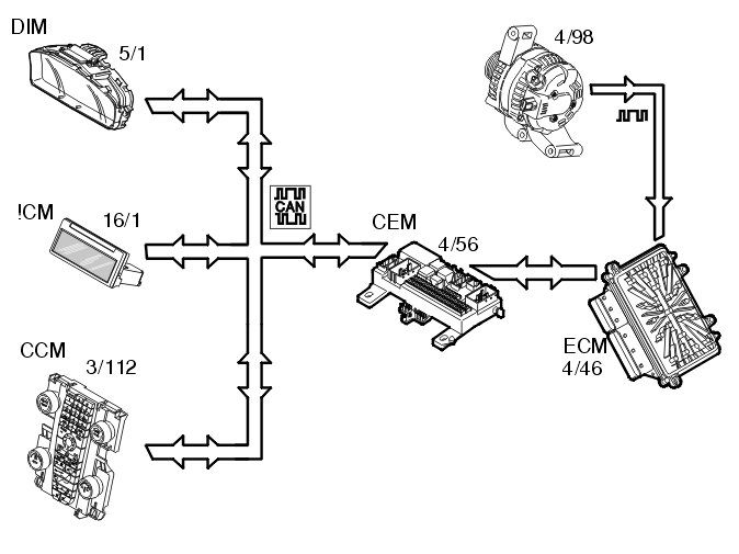 Central electronic module (CEM) (4/56) communicates with the engine control module (ECM) (4/46) on the controller area network (CAN) The engine control module (ECM) communicates with alternator control module (ACM) (4/98). In this way the central electronic module (CEM) receives information about how much current the generator produces and how much current can be used for the various loads in the vehicle.