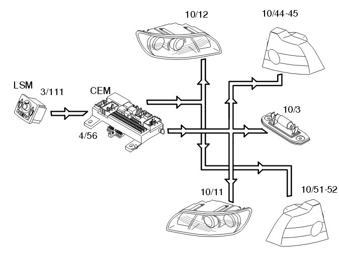 Depending on the position of the knob in the light switch module (LSM) (3/111), the module transmits a request to the central electronic module (CEM) to switch on low beam. Central electronic module (CEM) (4/56) supplies power to the low beam directly via an output.