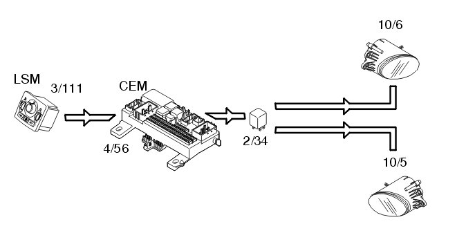 The front fog lamps (10/5-6) are activated by pressing the button for the front fog lamps in the light switch module (LSM) (3/111). The light switch module (LSM) is directly connected to the central electronic module (CEM) (4/56).