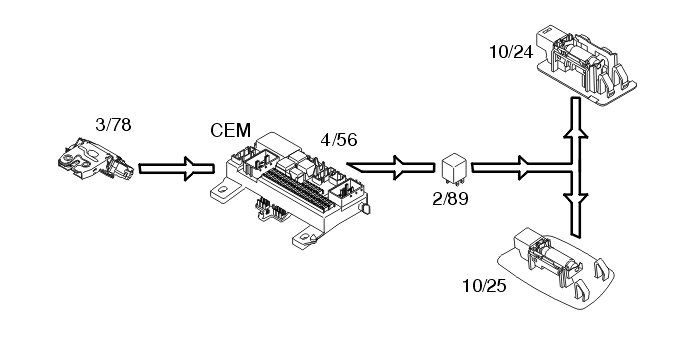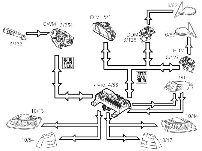 This function is controlled by the left control stalk (3/133). The steering wheel module (SWM) (3/254) sends signals via the control area network (CAN) to the central electronic module (CEM) (4/56) to activate the turn signal lamps (10/13-14 and 10/47-54).