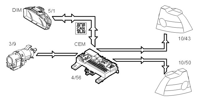 The rear fog lamps (10/46, 10/53) are activated by pressing the button for the rear fog lamps in the lamp switch module (3/111). The light switch module (LSM) is directly connected to the central electronic module (CEM) (4/56). The central electronic module (CEM) directly powers the lamps via an output.
