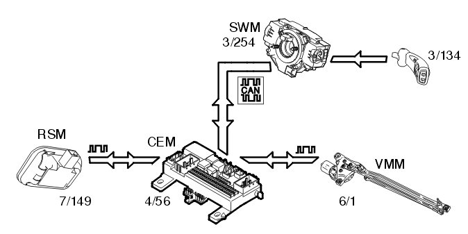 The right-hand control stalk (3/134) is moved downwards through three positions to operate the windshield wipers. The steering wheel module (SWM) (3/254) transmits information via the control area network (CAN) to the central electronic module (CEM) (4/56) about the selected position. The central electronic module (CEM) transmits the information on to the wiper motor module (WMM) (6/1) via serial communication.