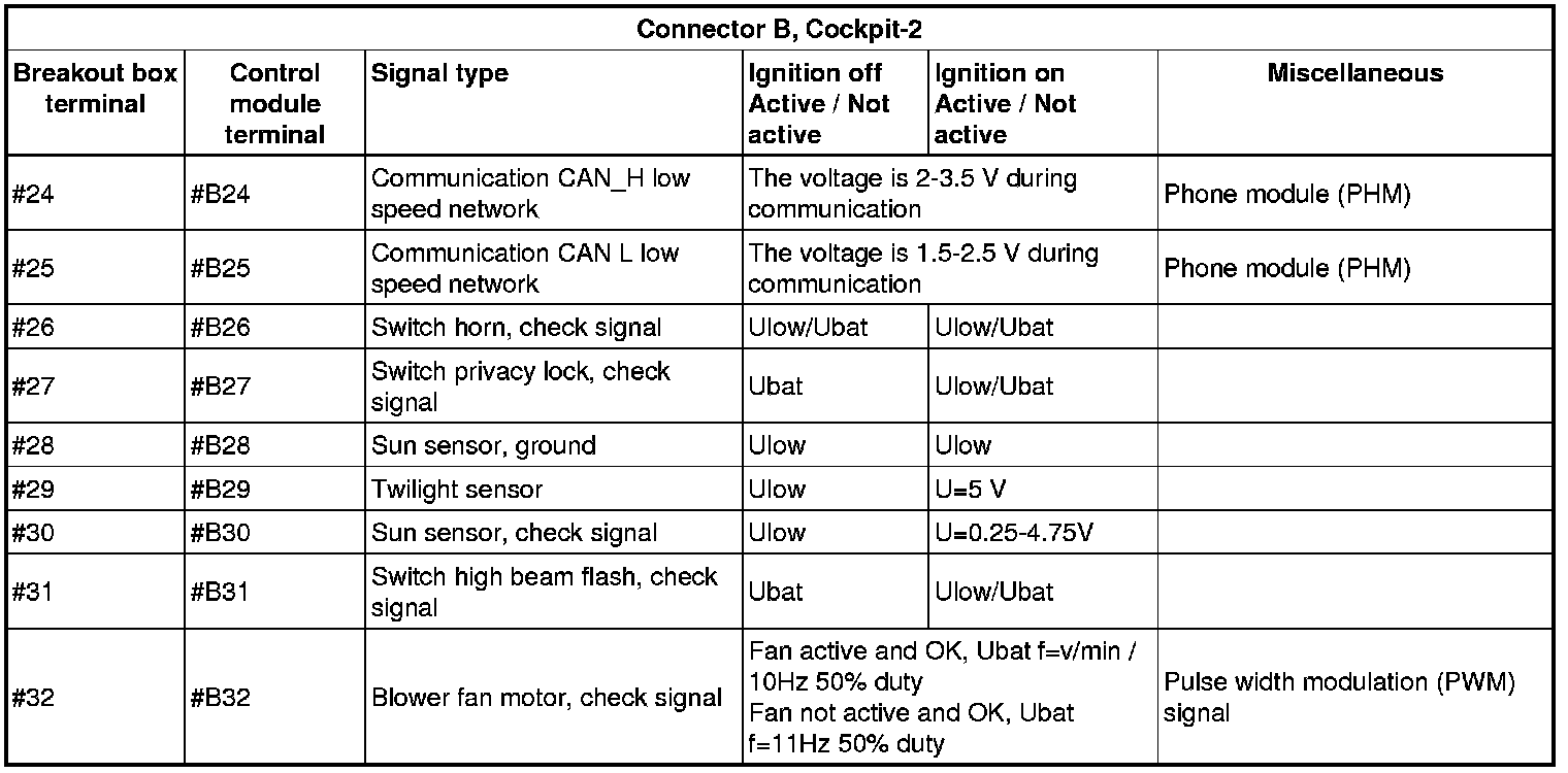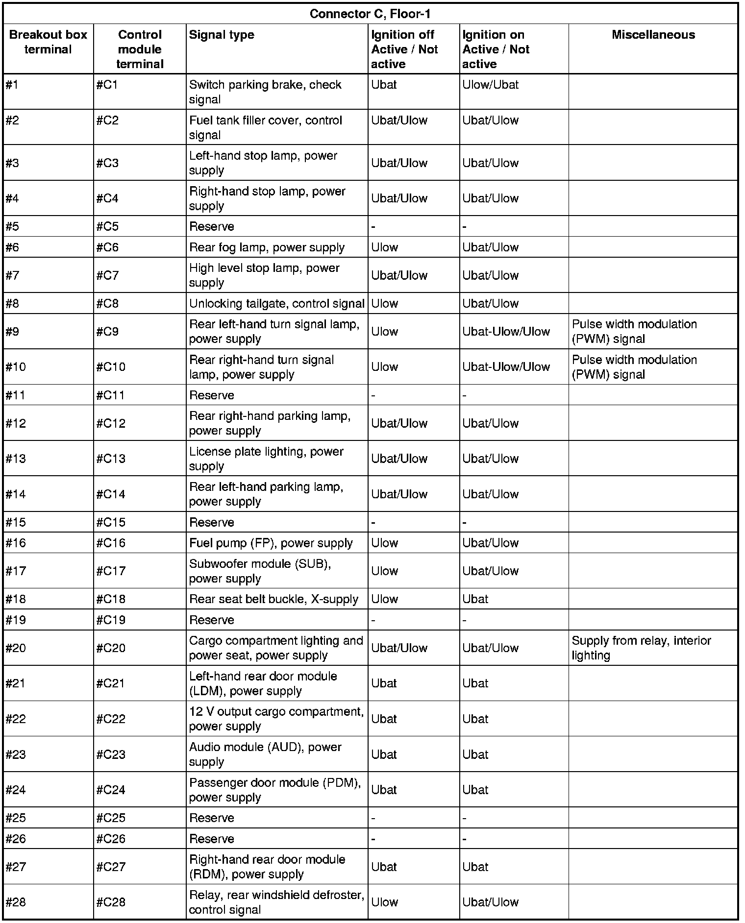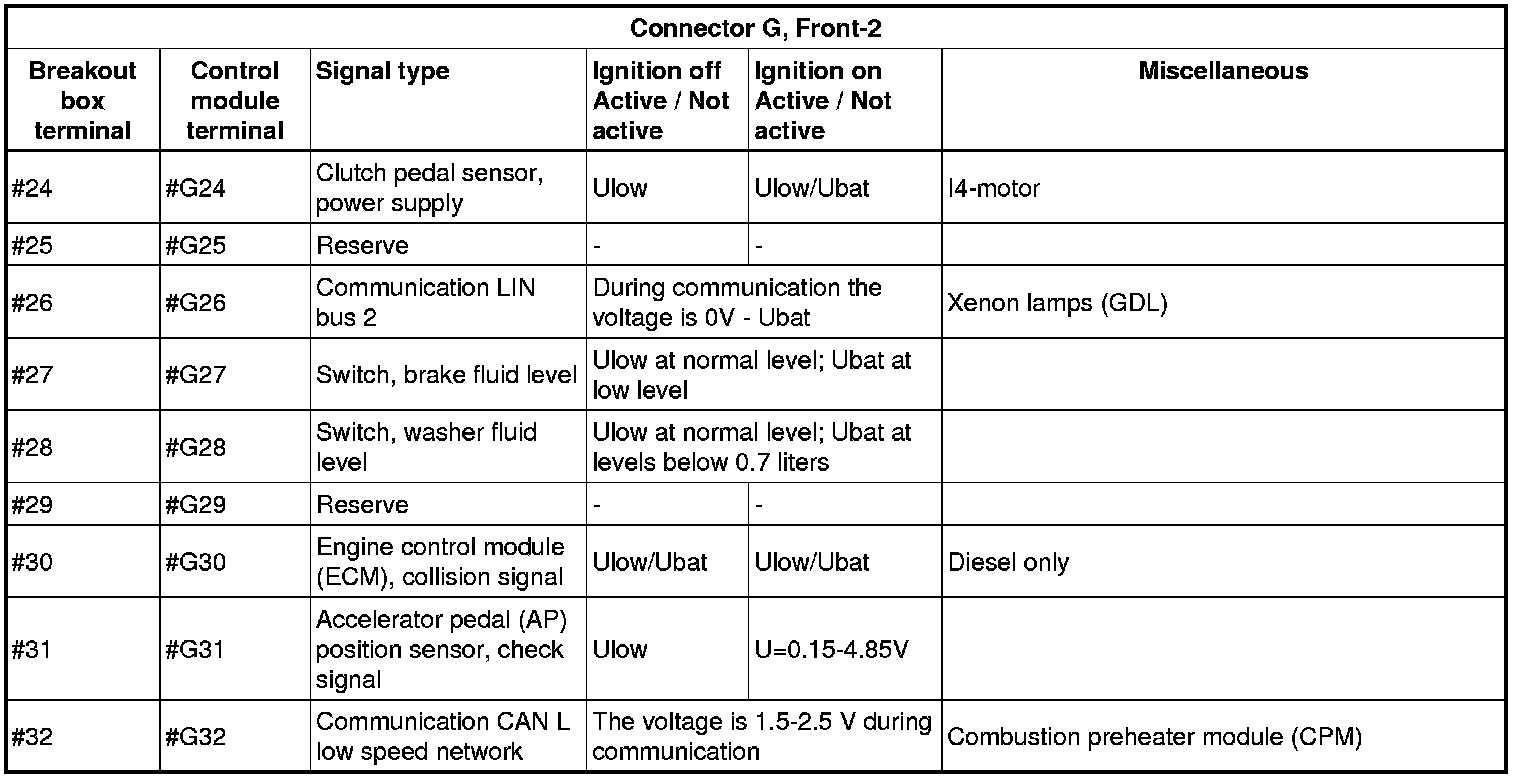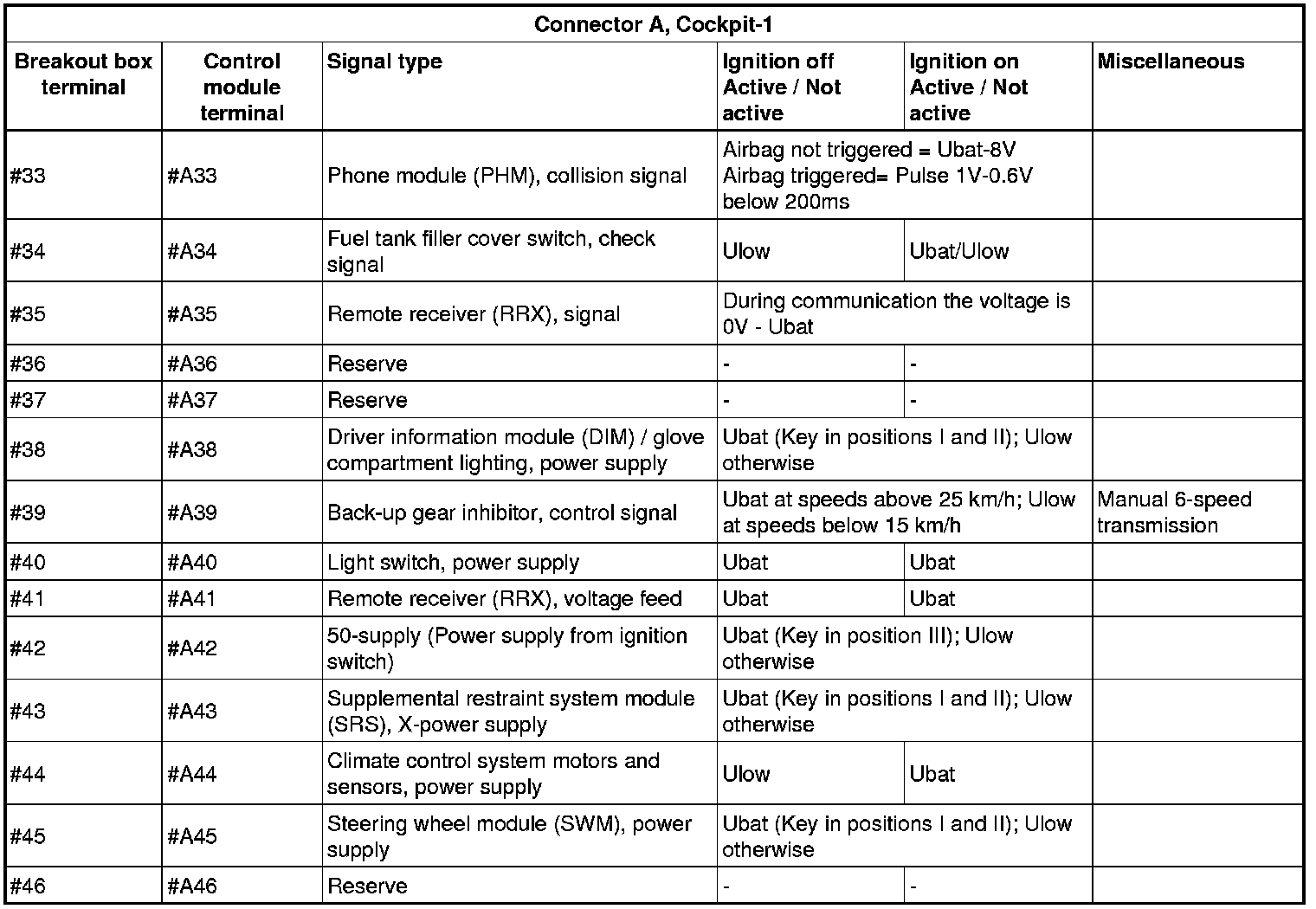All the values given below are between the connections in column 1 and connection #A28 in column 2 (power ground). This applies unless otherwise indicated in the last column.