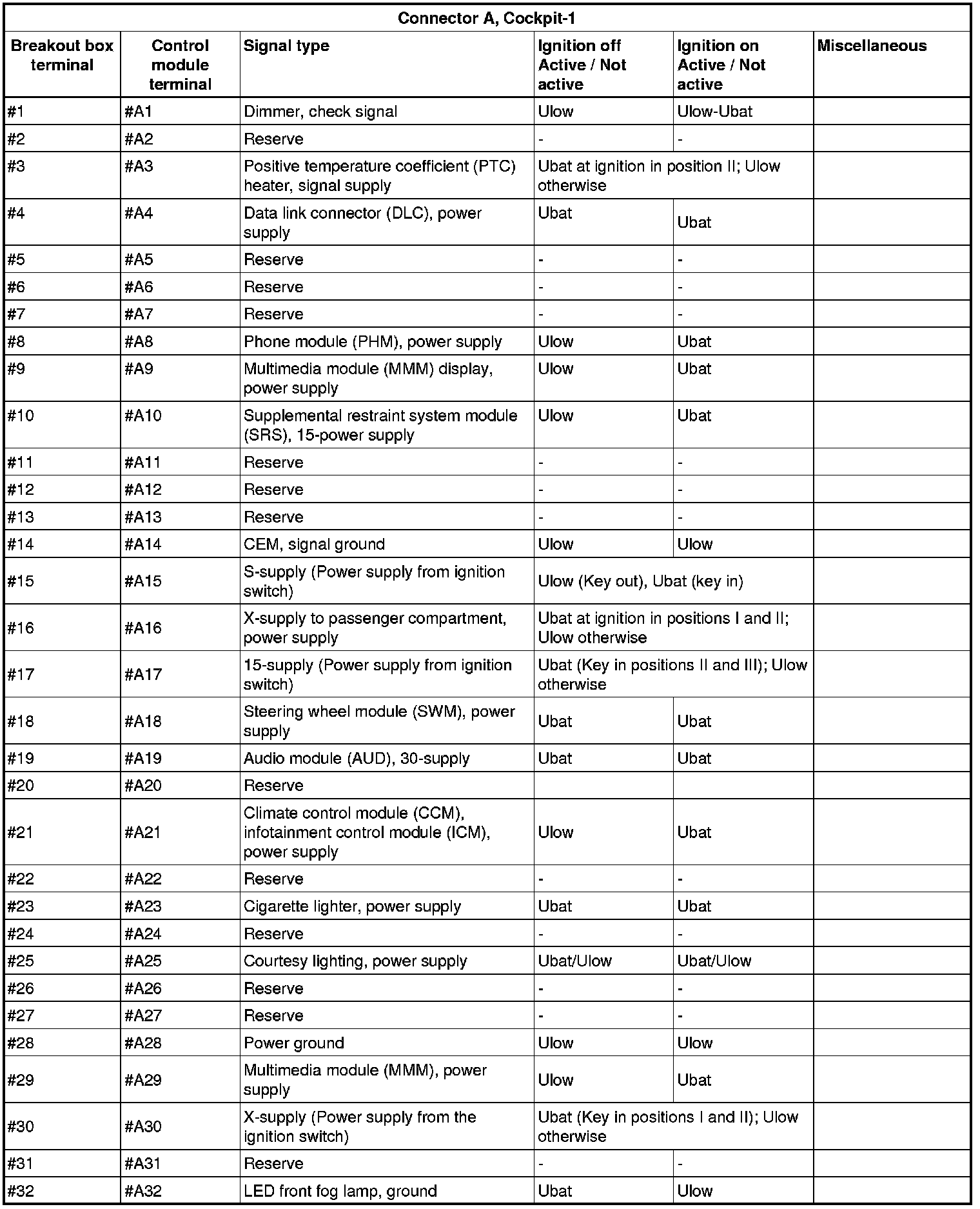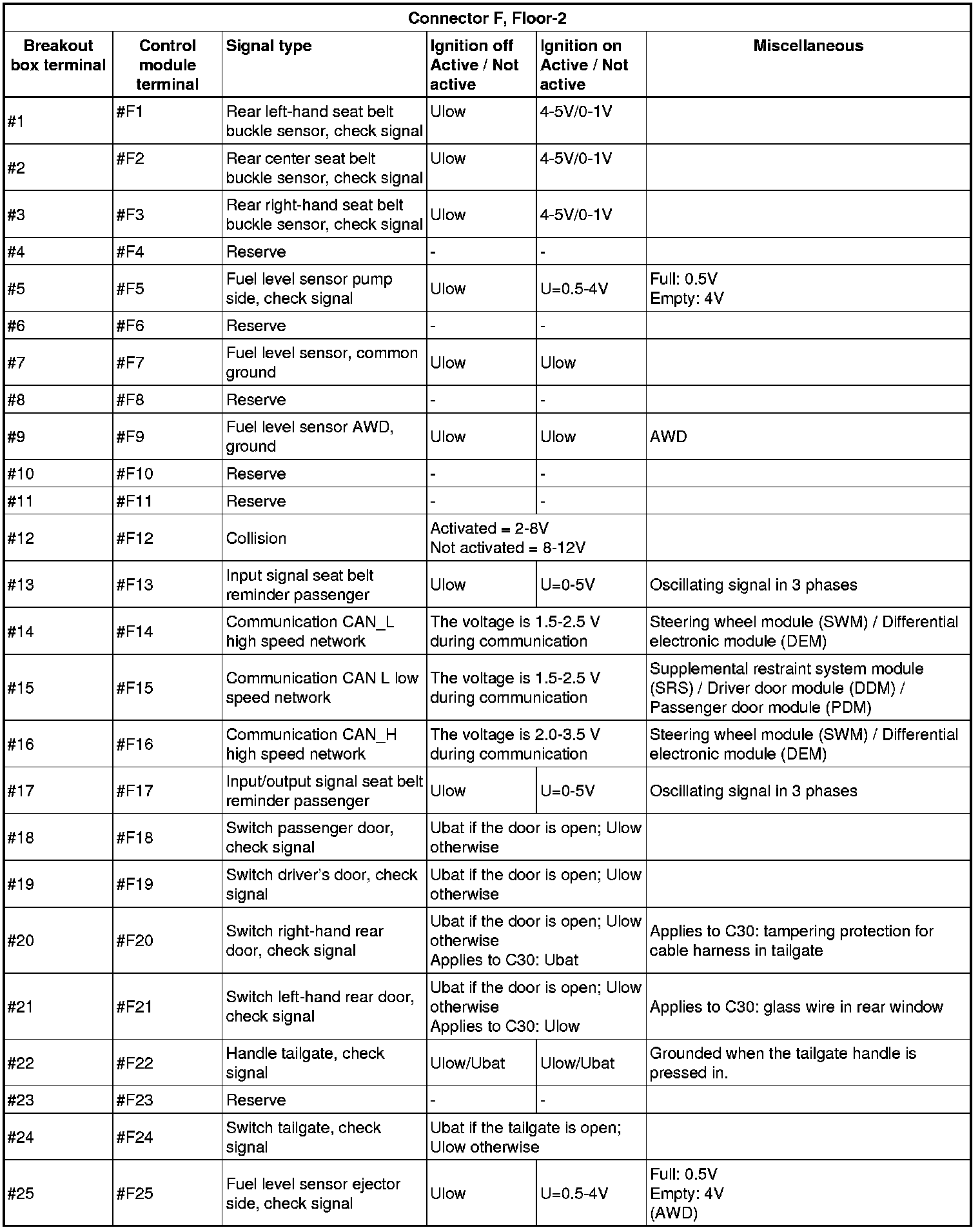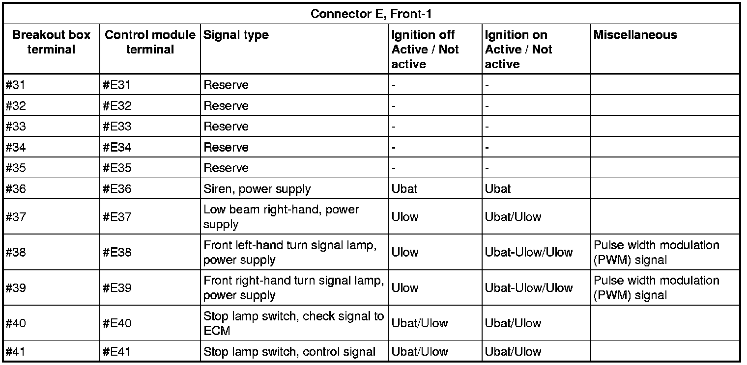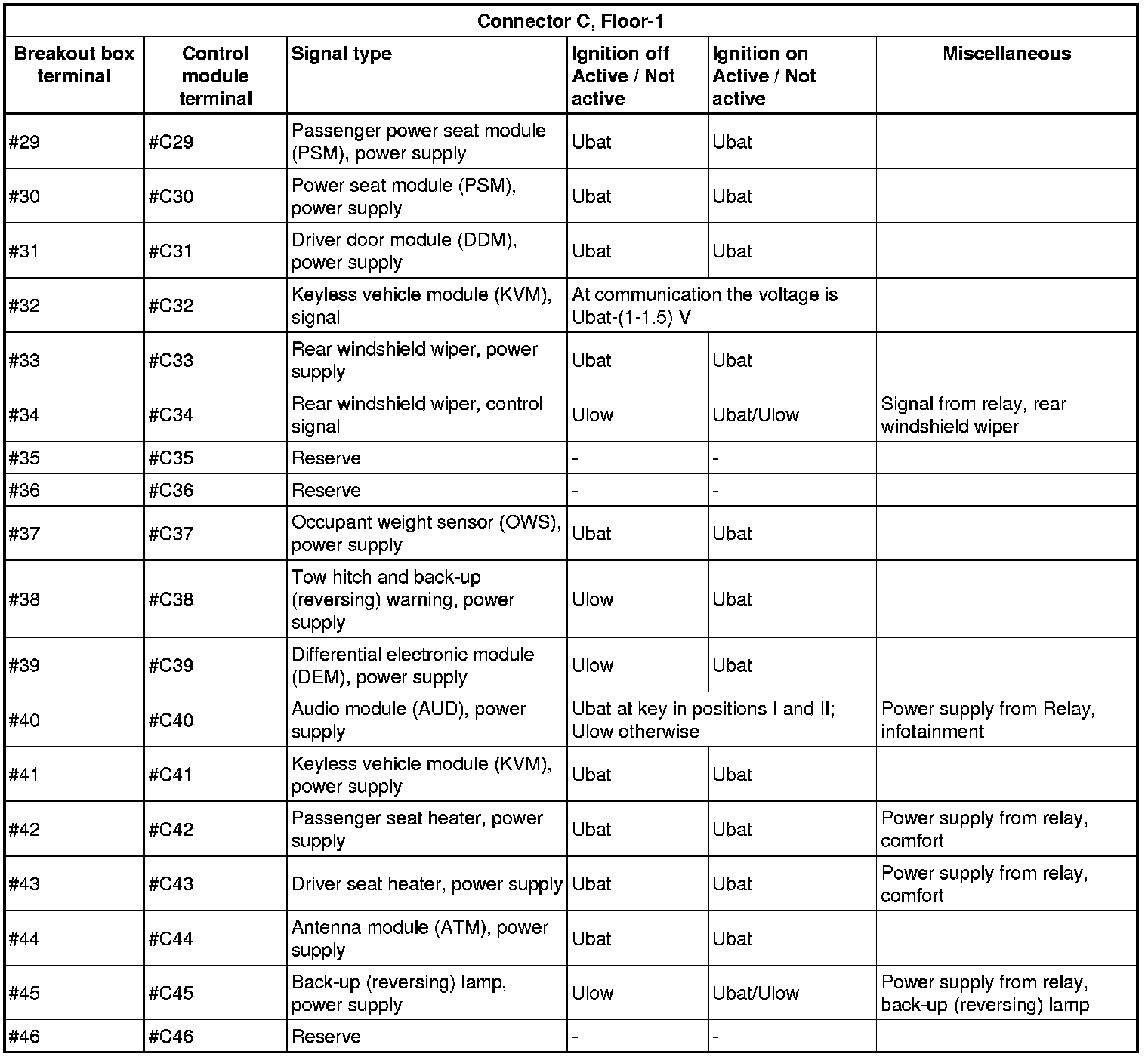 All the values given below are between the connections in column 1 and connection #A28 in column 2 (power ground). This applies unless otherwise indicated in the last column.