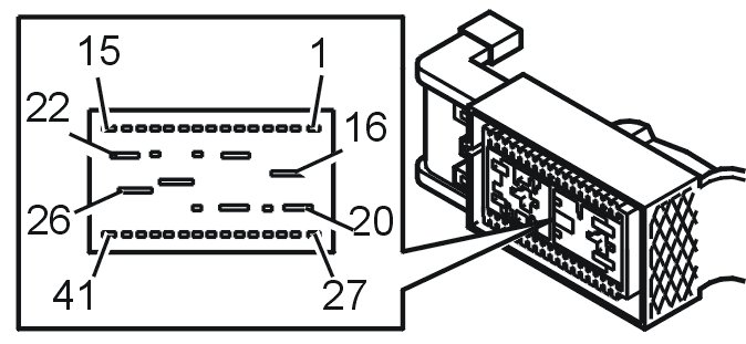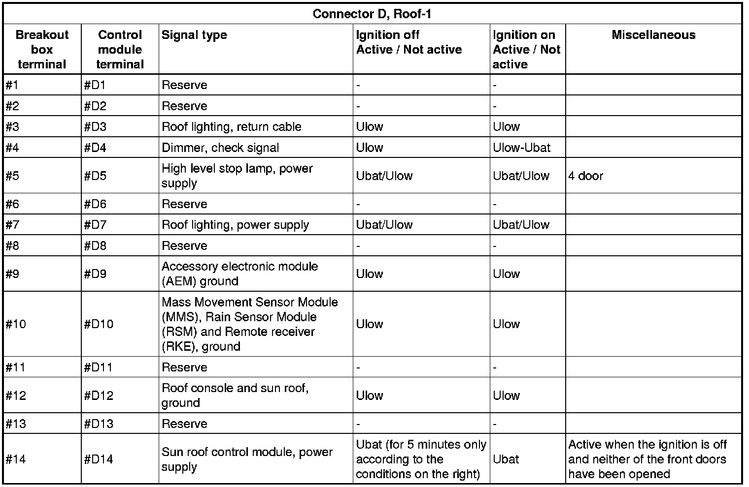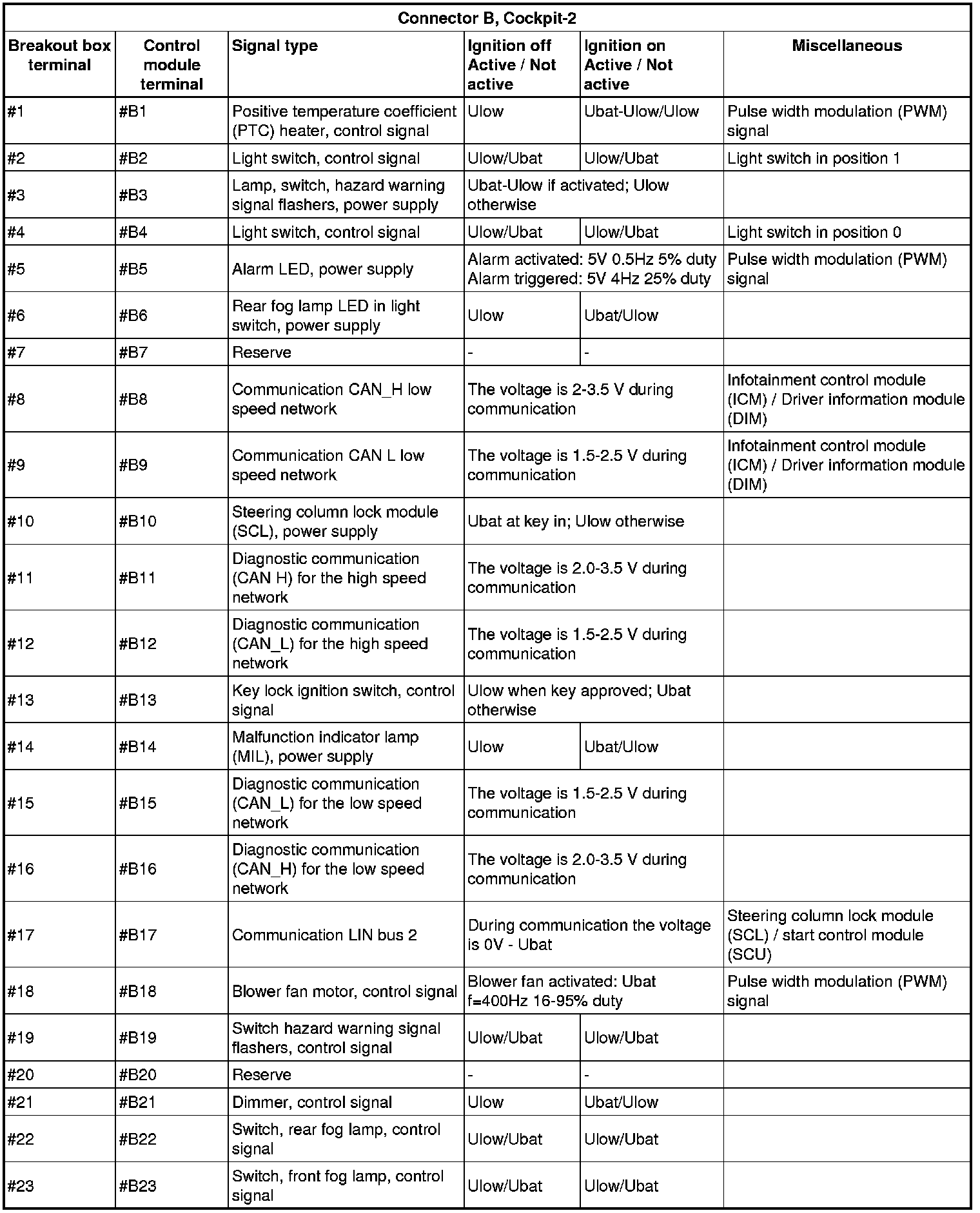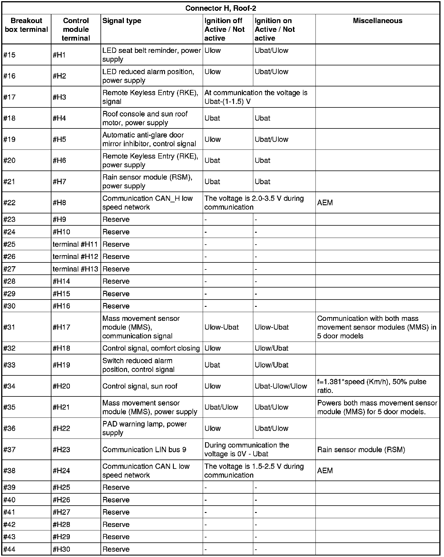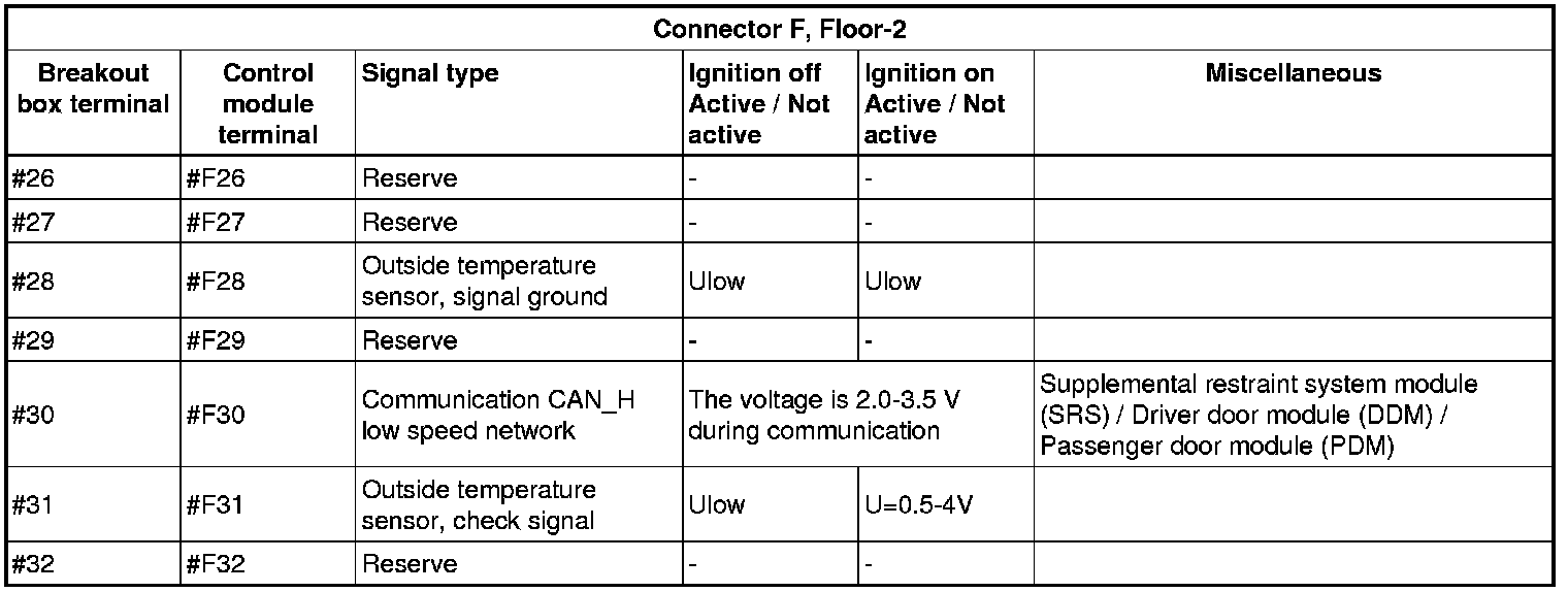 All the values given below are between the connections in column 1 and connection #A28 in column 2 (power ground). This applies unless otherwise indicated in the last column.