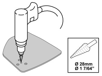 - Take the step drill and drill out the hole for the connection in the holder using a -28 mm (1 7/64") drill bit.