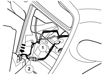 - Take the radio unit and connect the connector (1) that was disconnected from the 12V socket to the female connector (2) in the routed cable.