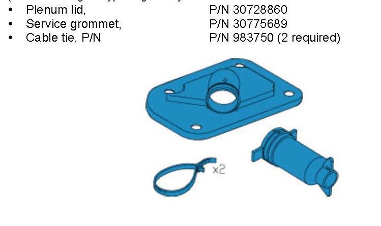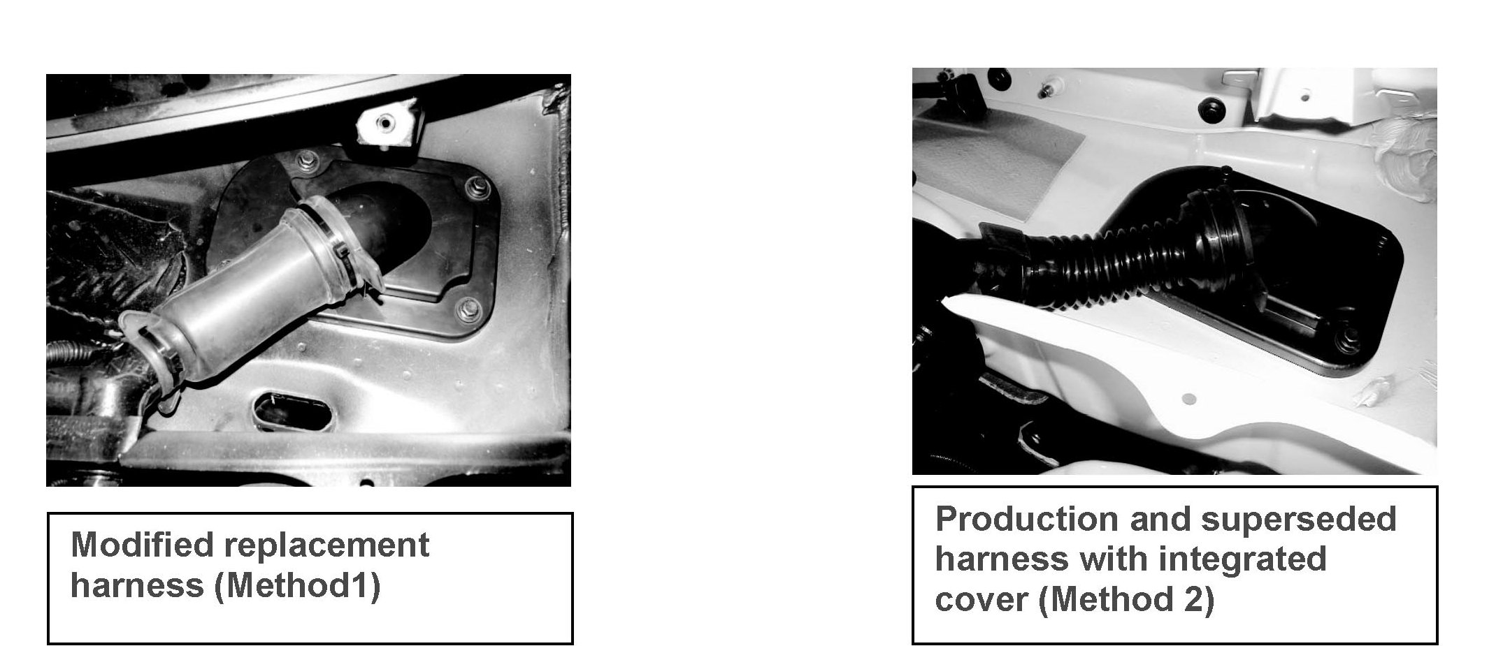 A new plenum sealing strategy with integrated rubber grommet was introduced in production from structure week 200540. See photo below. This new sealing strategy will be carried over to the replacement engine bay harnesses on the chassis numbers indicated, either by modification of the replacement harness (method 1), or by a superseded harness P/N with an integrated cover and grommet (method 2).