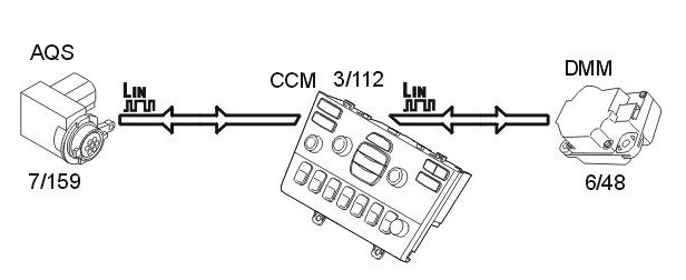 The air quality sensor (AQS) (7/159) transmits a signal to the climate control module (CCM) if it detects raised concentrations of pollutants in the outside air. When this occurs, the climate control module (CCM) transmits a signal to the damper motor for recirculation (6/48) to close the fresh air damper and to use recirculated air.