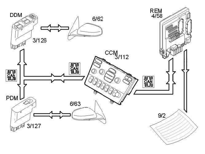 When the switch for the folding door mirrors is activated, information is transmitted by the climate control module (CCM) to the driver door module (3/126) and the passenger door module (PDM) (3/127) via the control area network (CAN).