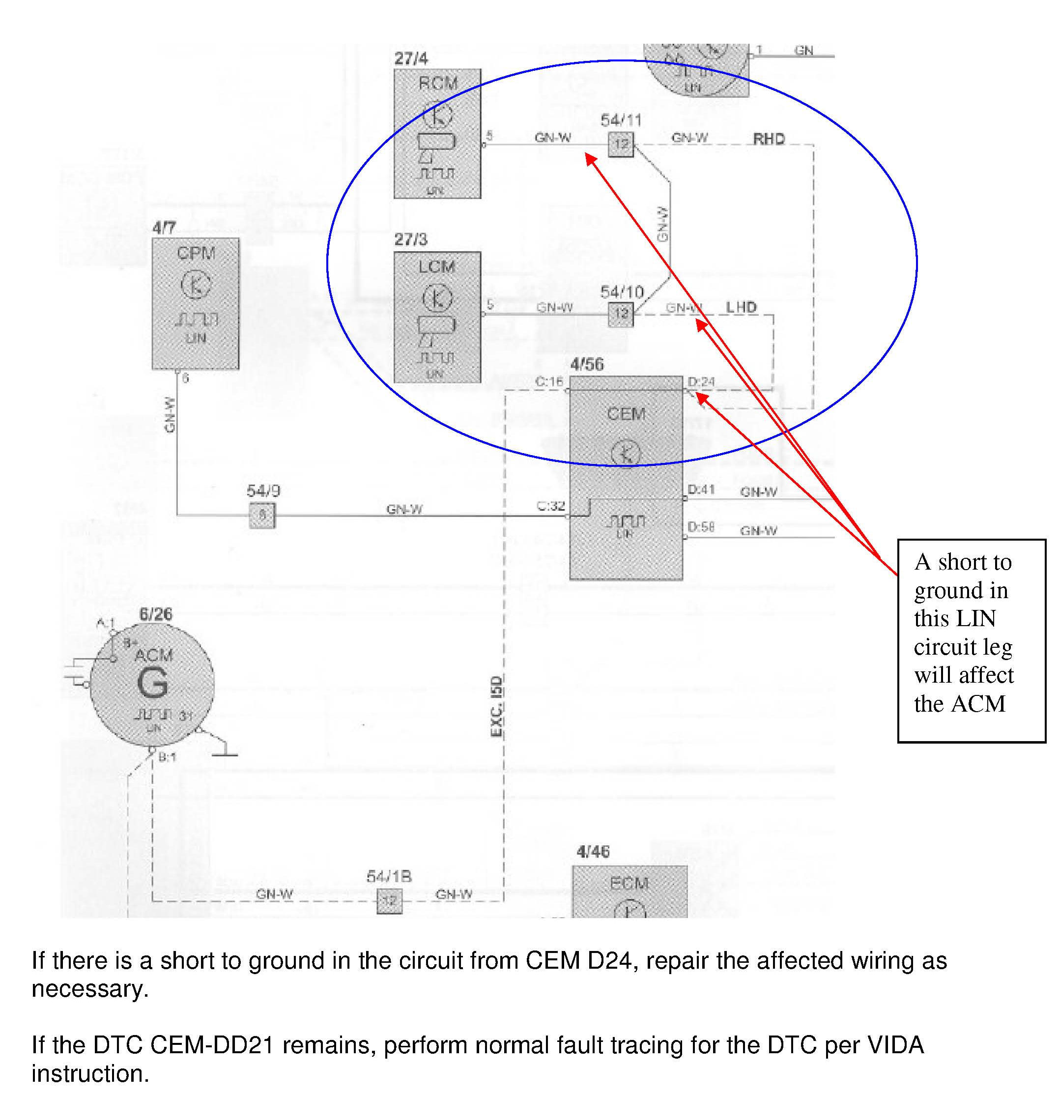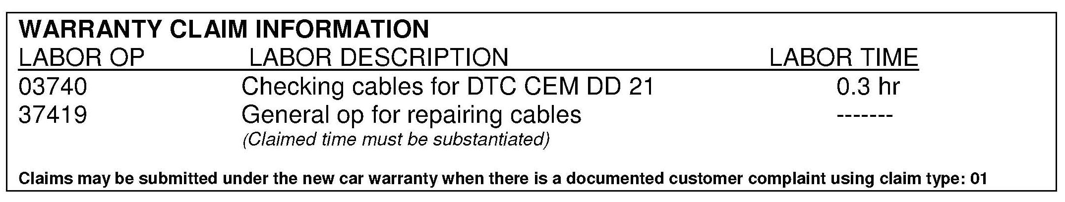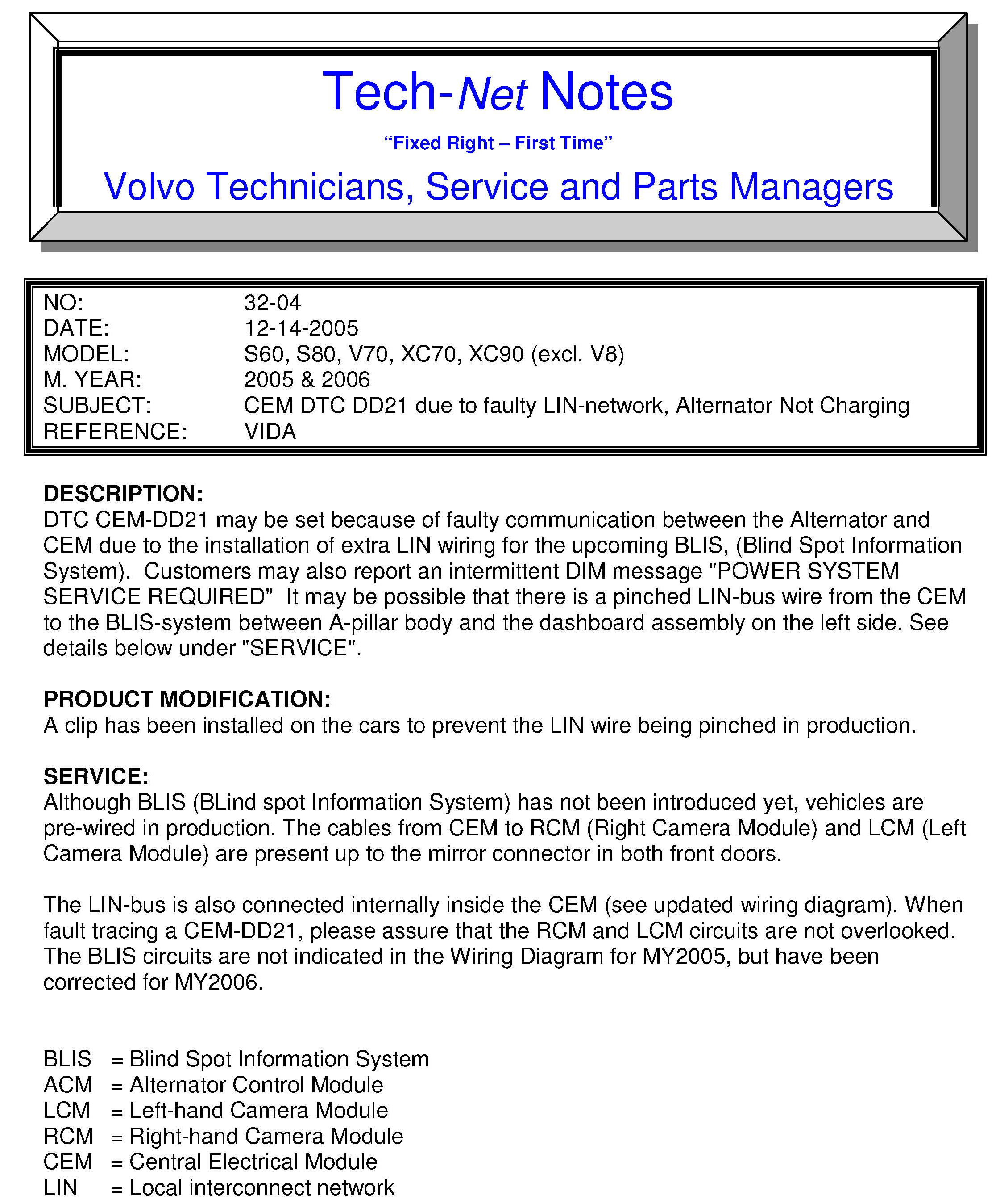 DTC CEM-DD21 may be set because of faulty communication between the Alternator and CEM due to the installation of extra LIN wiring for the upcoming BLIS (Blind Spot Information System). Customers may also report an intermittent DIM message "POWER SYSTEM SERVICE REQUIRED" It may be possible that there is a pinched LIN-bus wire from the CEM to the BLIS-system between A-pillar body and the dashboard assembly on the left side. See details below under "SERVICE".