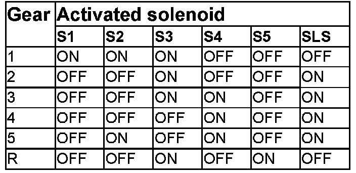 Shifting and the lock-up function is controlled by activating the solenoids in a specific pattern. The solenoids S1-S5 determine which gear is to be used and the SLS, SLU and SLT solenoids determine engagement by adjusting hydraulic line pressure. The basic parameters for the different shifting points are the Accelerator Pedal (AP) position and the vehicle speed. The shift quality is decided by the control of torque.