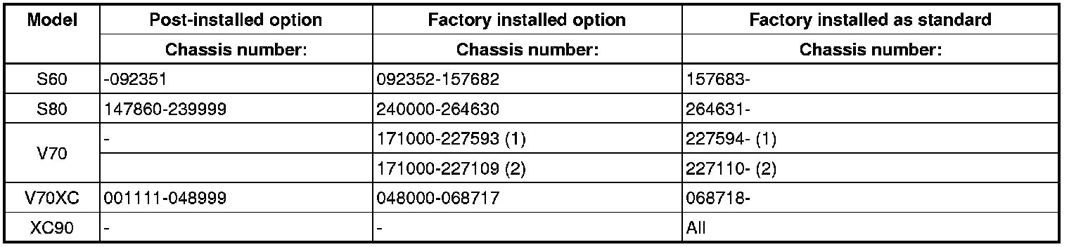The wiring for the accessory electronic module (AEM) has been post-installed or factory installed as an option on early version cars. The wiring is now factory installed in all cars. See the table below for the chassis numbers.