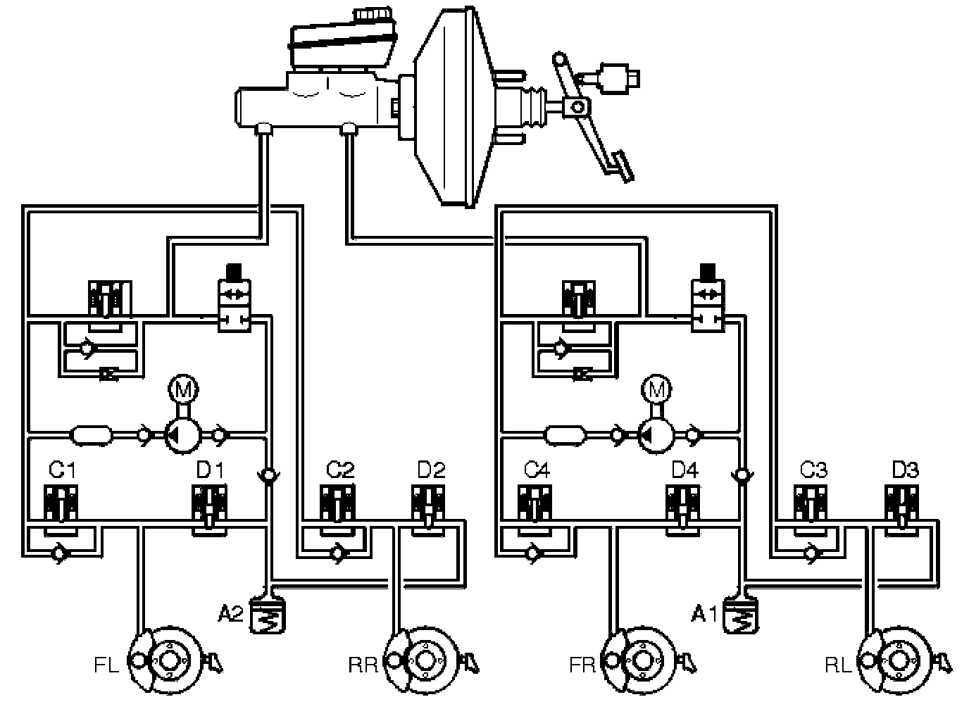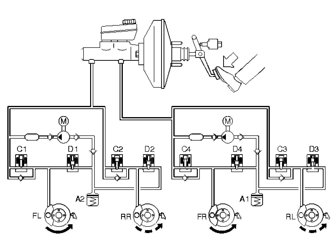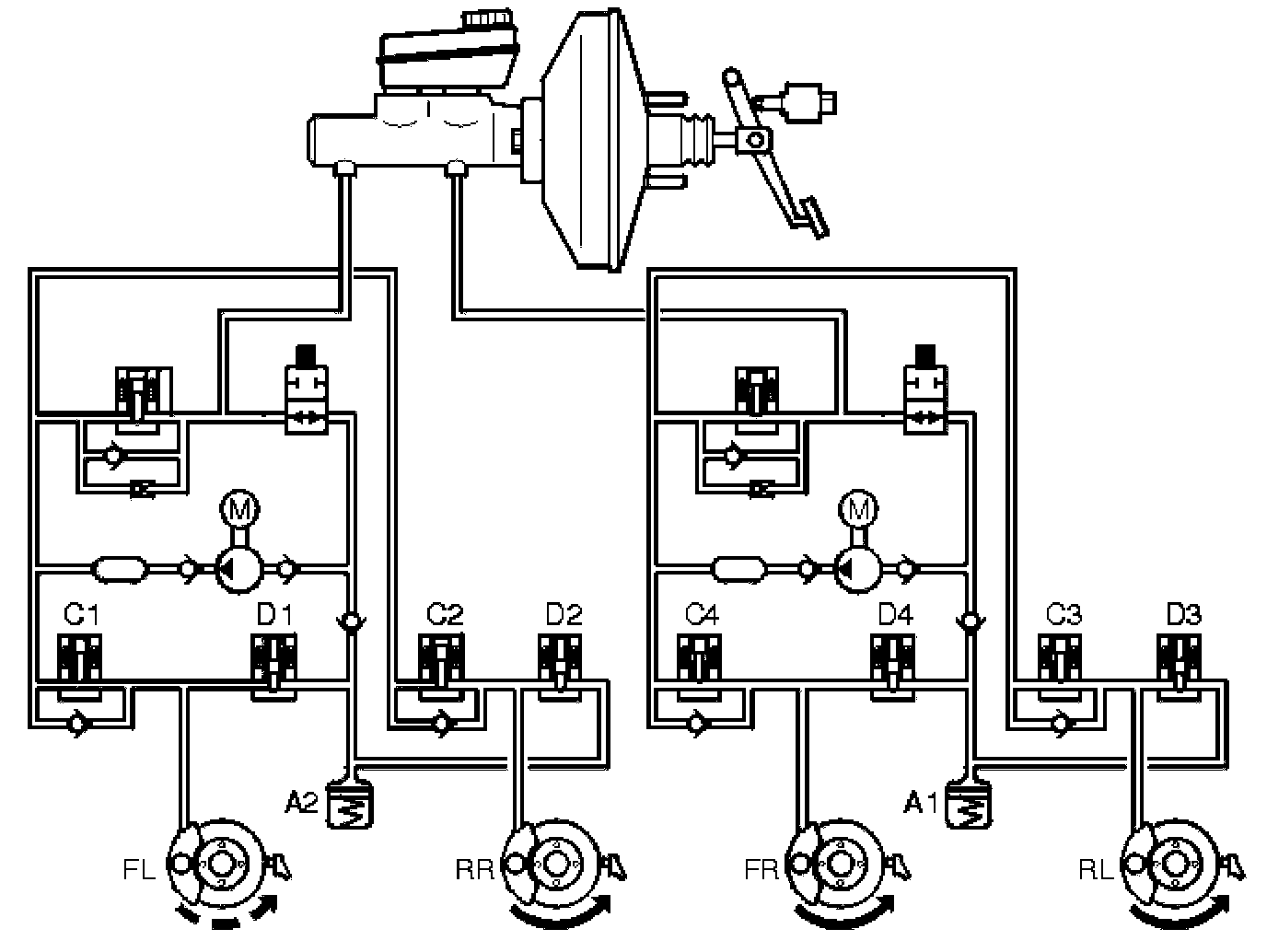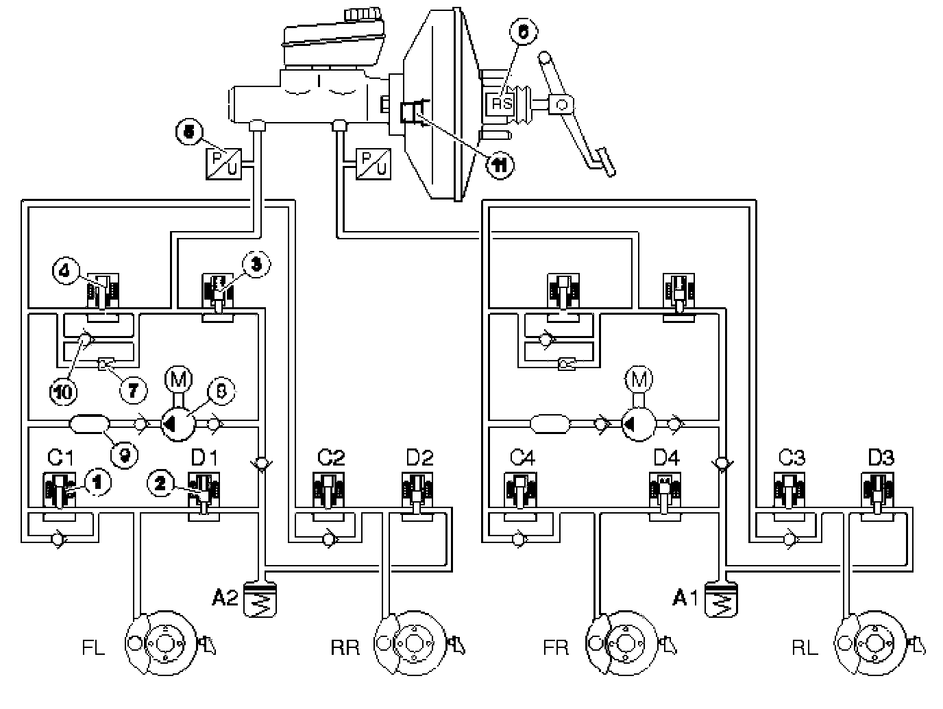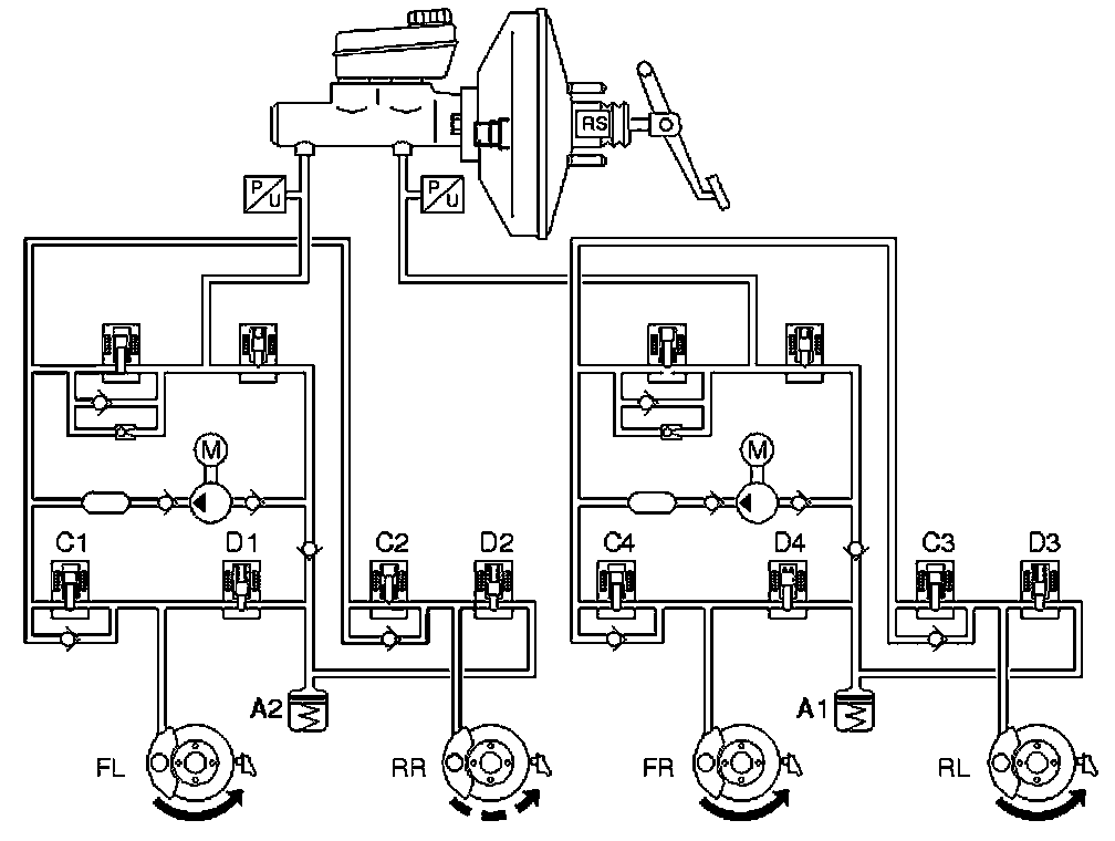 If the wheel locks anyway, the outlet valve opens and the brake fluid is allowed back to the accumulators resulting in a reduction in the brake circuit pressure (pressure release, see the left front wheel - FL). This reduces the hydraulic pressure and braking effect, allowing the wheel to accelerate. The hydraulic pump returns the brake fluid from the accumulators to the master cylinder.