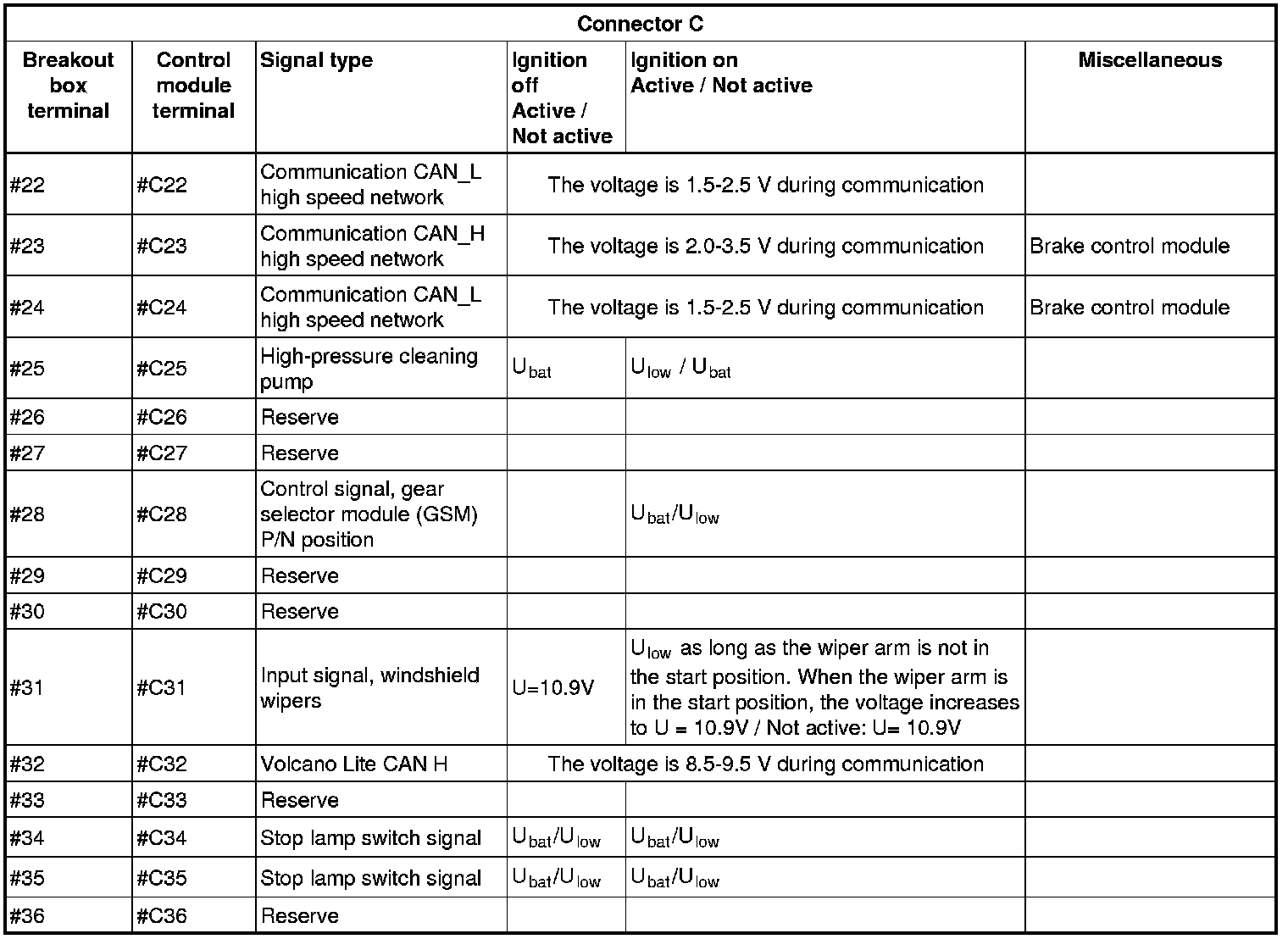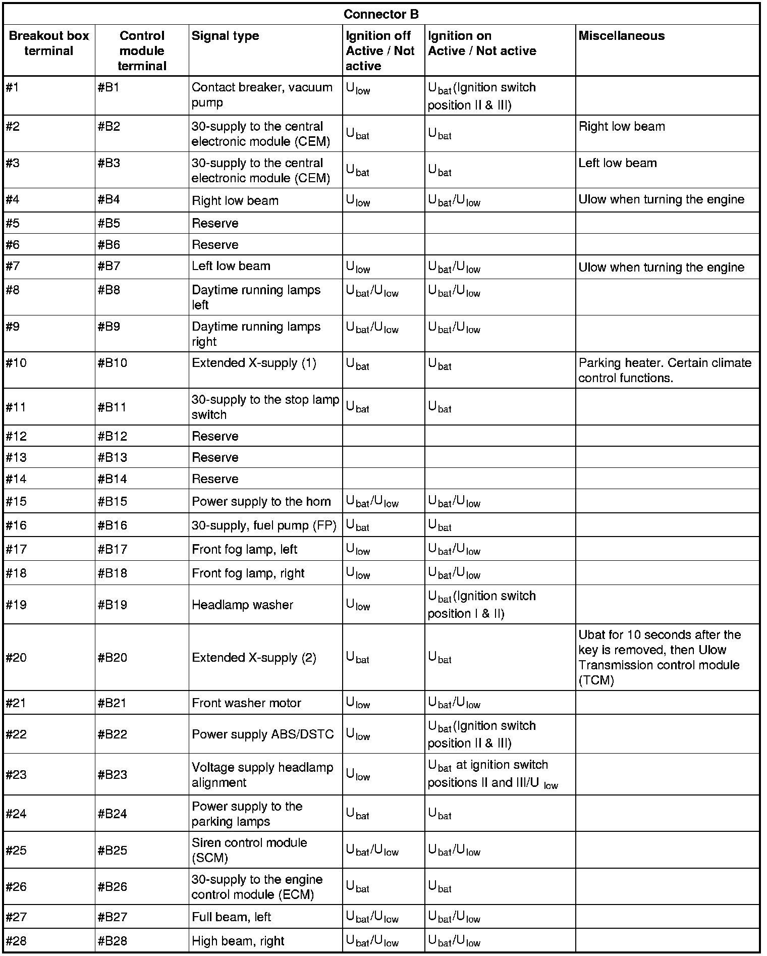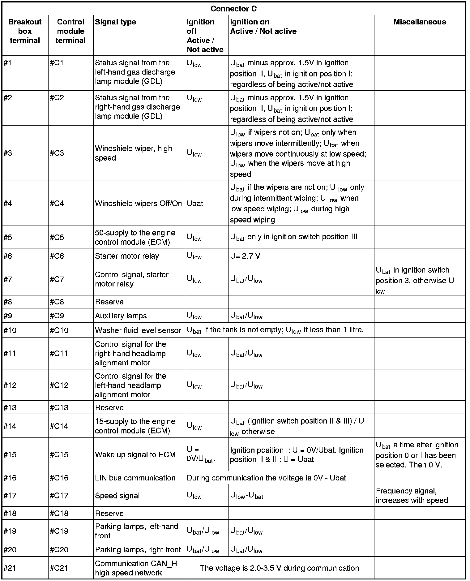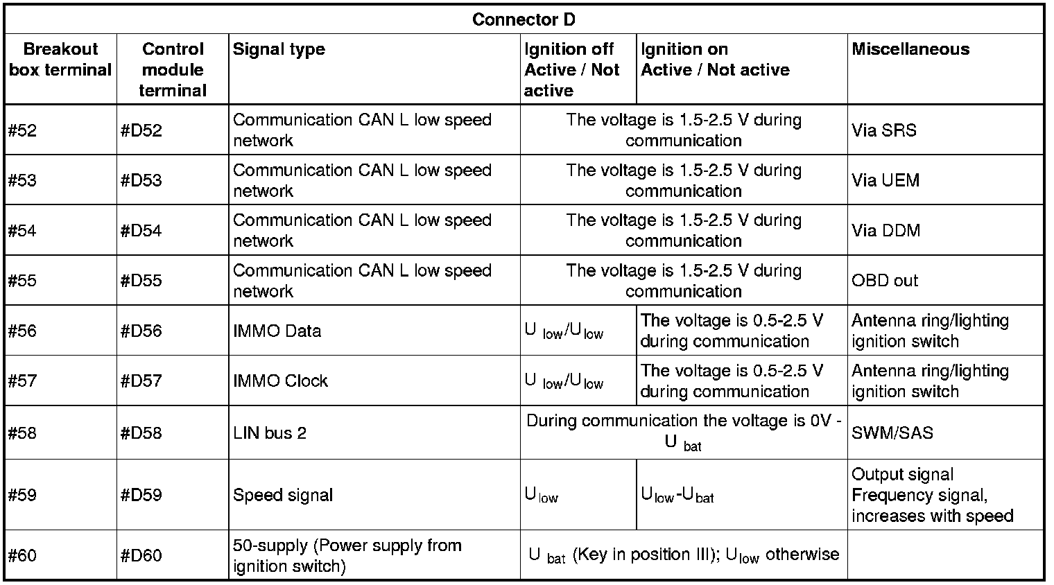 All the values given below are between the terminals stated in column 1 and terminal #D6 in column 2 (power ground). This applies unless otherwise indicated in the last column.