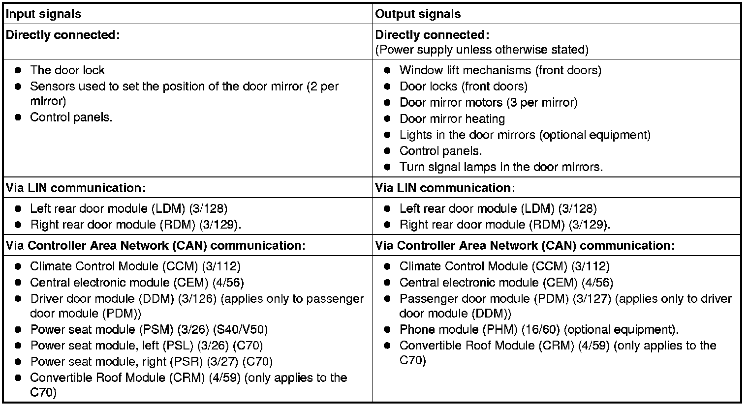 The table below summarizes the input signals to and output signals from the driver door module (DDM) and passenger door module (PDM). The signal types are divided into directly connected signals, LIN and CAN communication. The illustration below displays the same information with the Volvo component designations.
