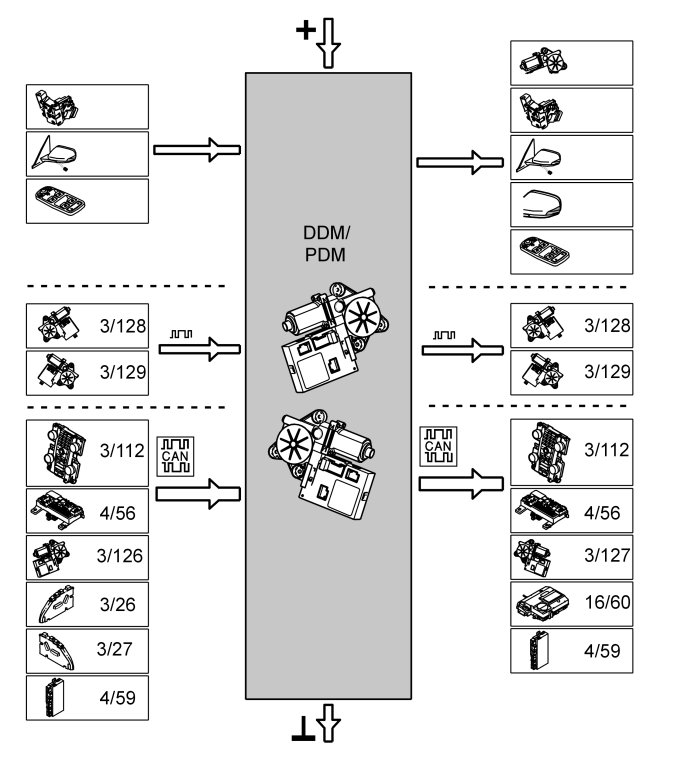 The driver door module (DDM) and passenger door module (PDM) communicate with directly connected components and with other control modules and components connected via controller area network (CAN).