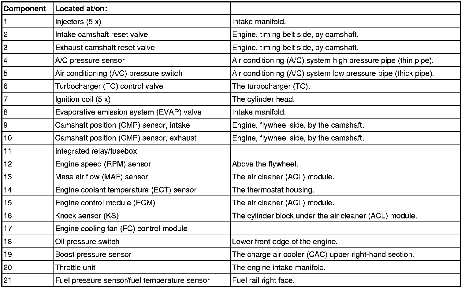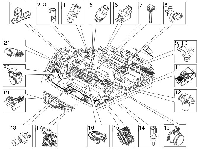 Not all the following components are necessarily in the car. The components vary between engine types.