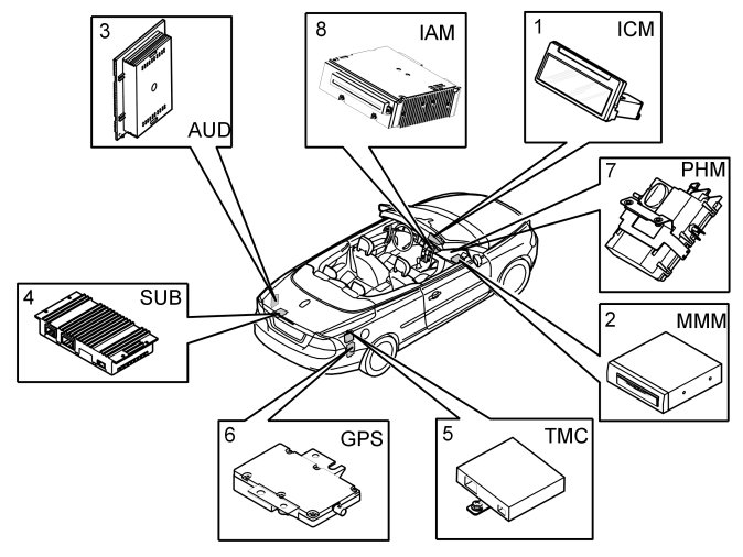 The infotainment control module (ICM) deals with monitoring and communication on the MOST network. The infotainment control module (ICM) is in turn monitored by the central electronic module (CEM) on the CAN network.