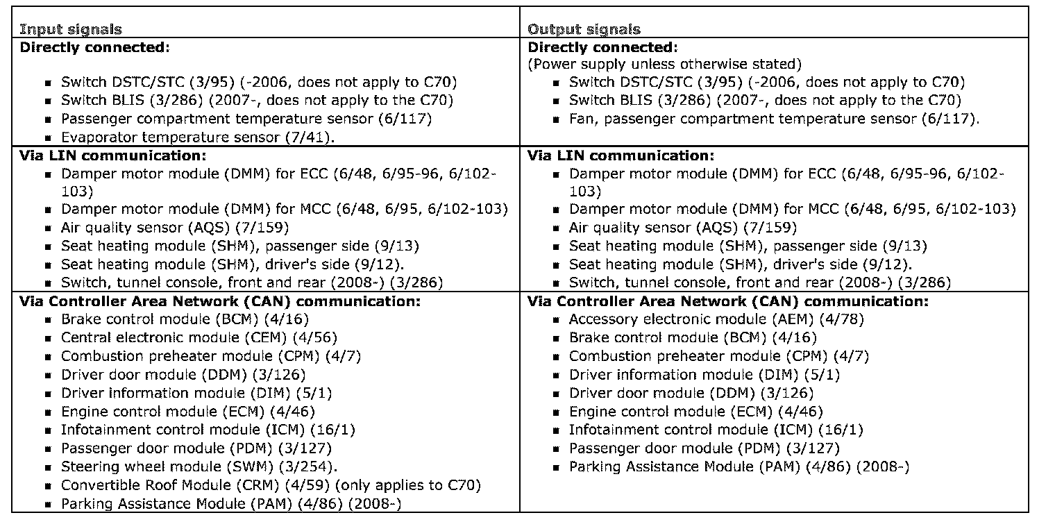 The table below summarizes the input signals to and output signals from the climate control module (CCM). The signal types are divided into directly connected signals, LIN and CAN communication. The illustration below displays the same information with the Volvo component designations.
