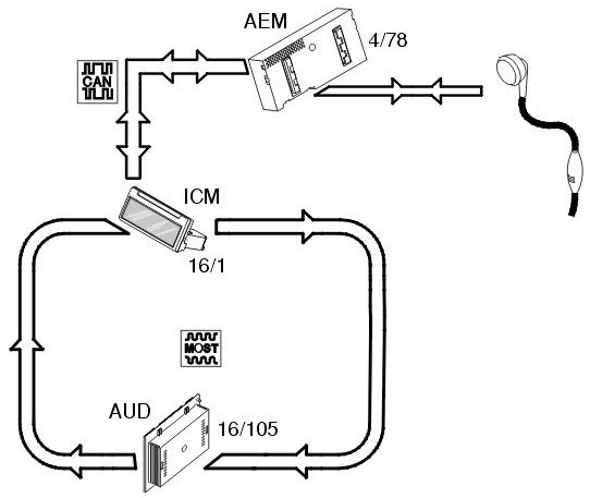 In the event of a call the accessory electronic module (AEM) (4/78) receives an input signal from the hands free unit (post installed) and forwards this on the Controller area network (CAN) to the infotainment control module (ICM) (16/1). The infotainment control module (ICM) transmits the signal in turn via the MOST network to the audio module (AUD) (16/105) which mutes the loudspeakers.