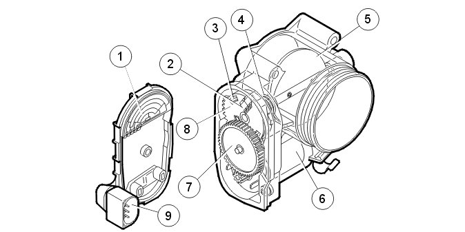 The electronic throttle unit consists of a round throttle disc on a shaft. This is turned using a DC motor (damper motor), gear wheel and two springs, an opening spring and a return spring. The damper motor is controlled by the control module and is supplied with powered by a built in power stage in the control module. At one of the limit positions the throttle disc is closed so that no air can pass the throttle unit. At the other limit position the throttle disc is parallel to the air flow so that the air is able to freely pass through the throttle unit. The throttle disc shaft is mechanically connected to two built-in potentiometers (position sensors) which are supplied with power by the control module. The signals from the potentiometers provide the control module with data about the position of the throttle disc. The throttle unit also has a connector with six gold plated terminal pins.