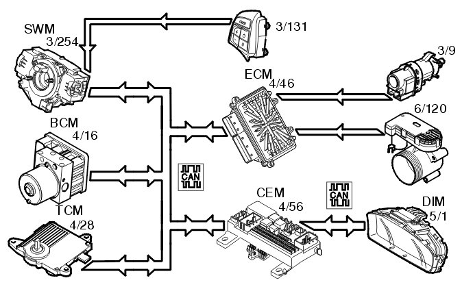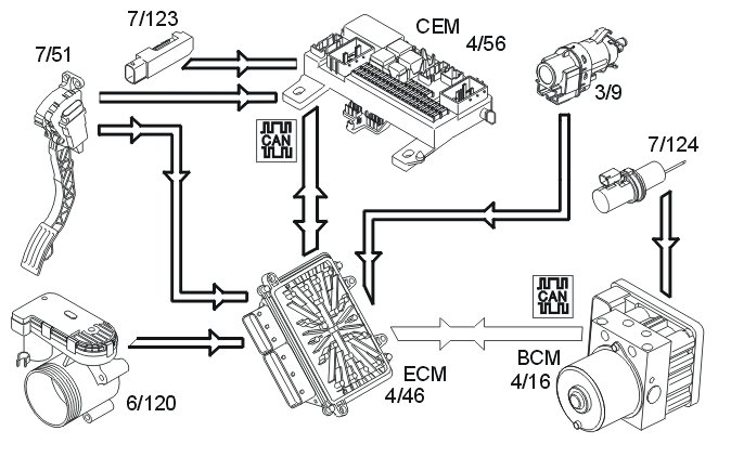 - clutch pedal sensor (7/123) via central electronic module (CEM) (4/56)