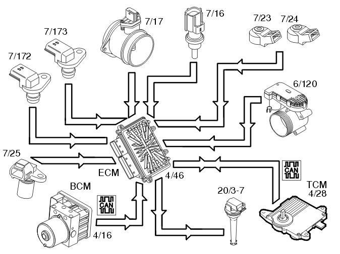 - brake pedal sensor (7/124) via brake control module (BCM) (4/16).