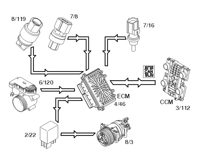 In addition to the information from the climate control module (CCM), the engine control module (ECM) checks the engagement and disengagement of the A/C compressor based on: