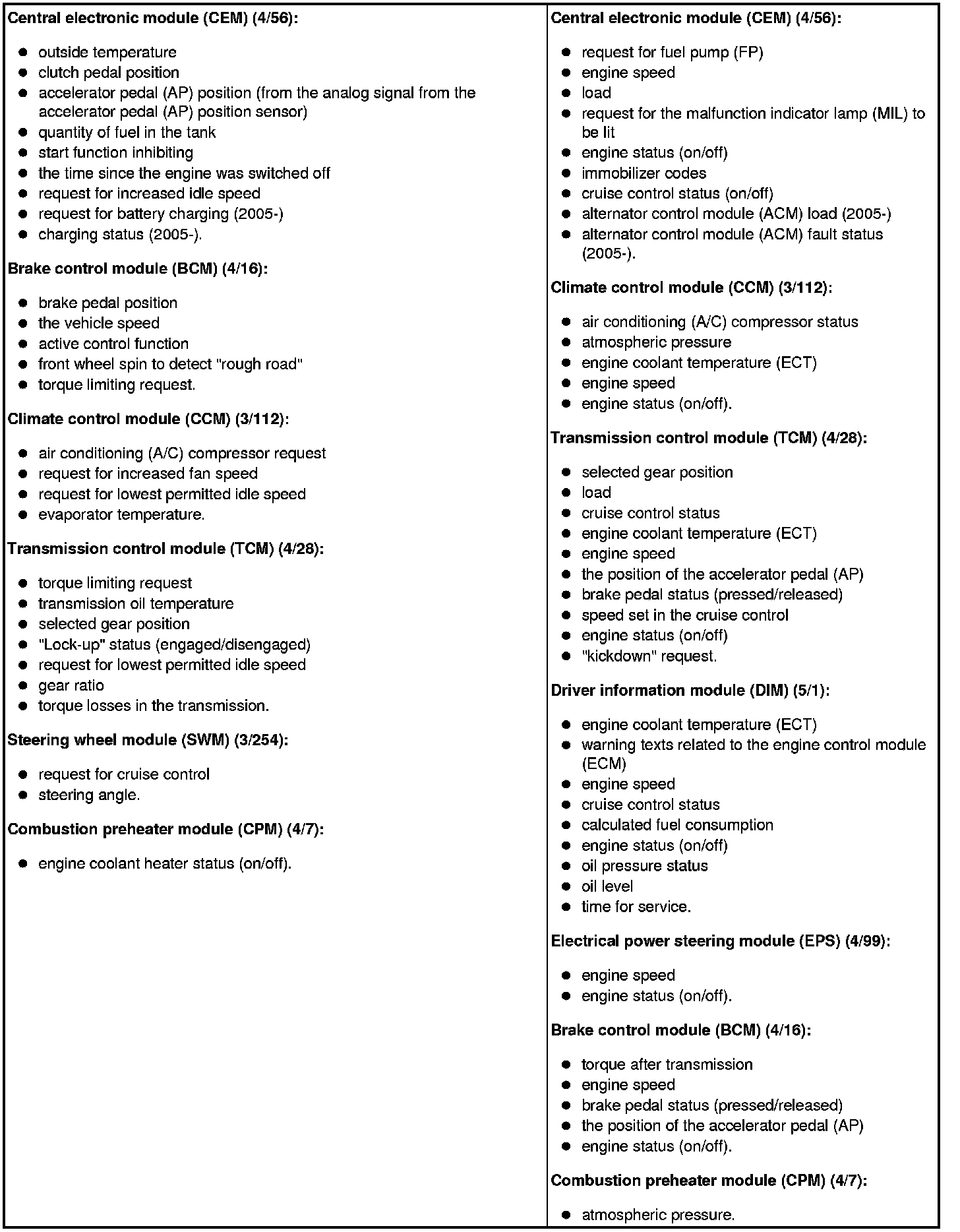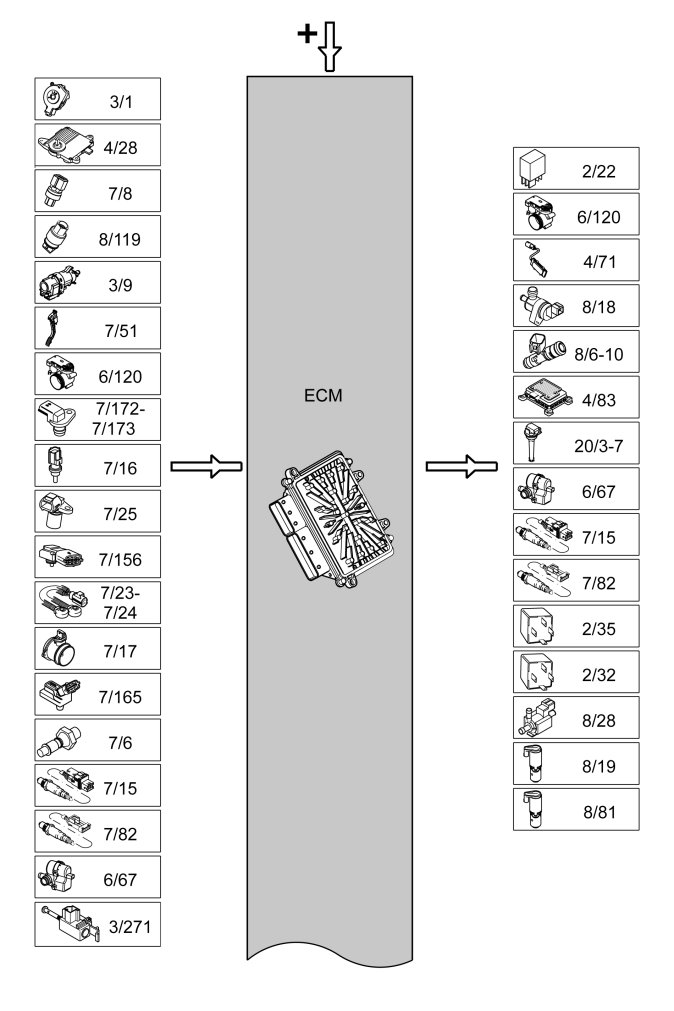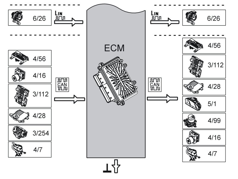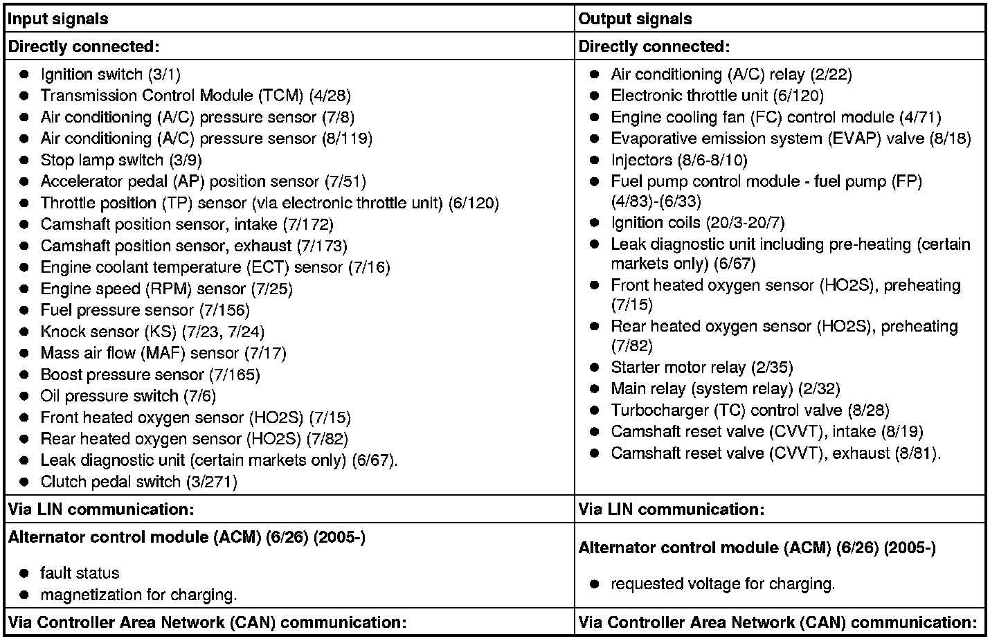 The table below summarizes the input signals to and output signals from the Engine Control Module (ECM). The signal types are divided into directly connected signals, serial communication and controller area network (CAN) communication. The illustration below displays the same information with the Volvo component designations.