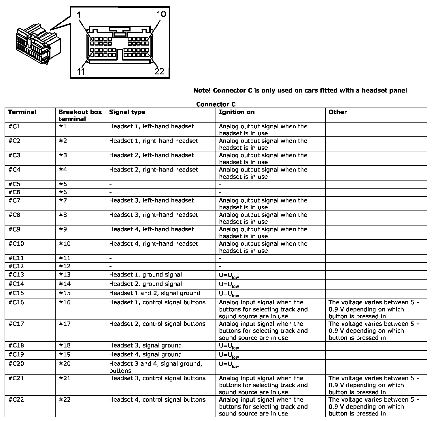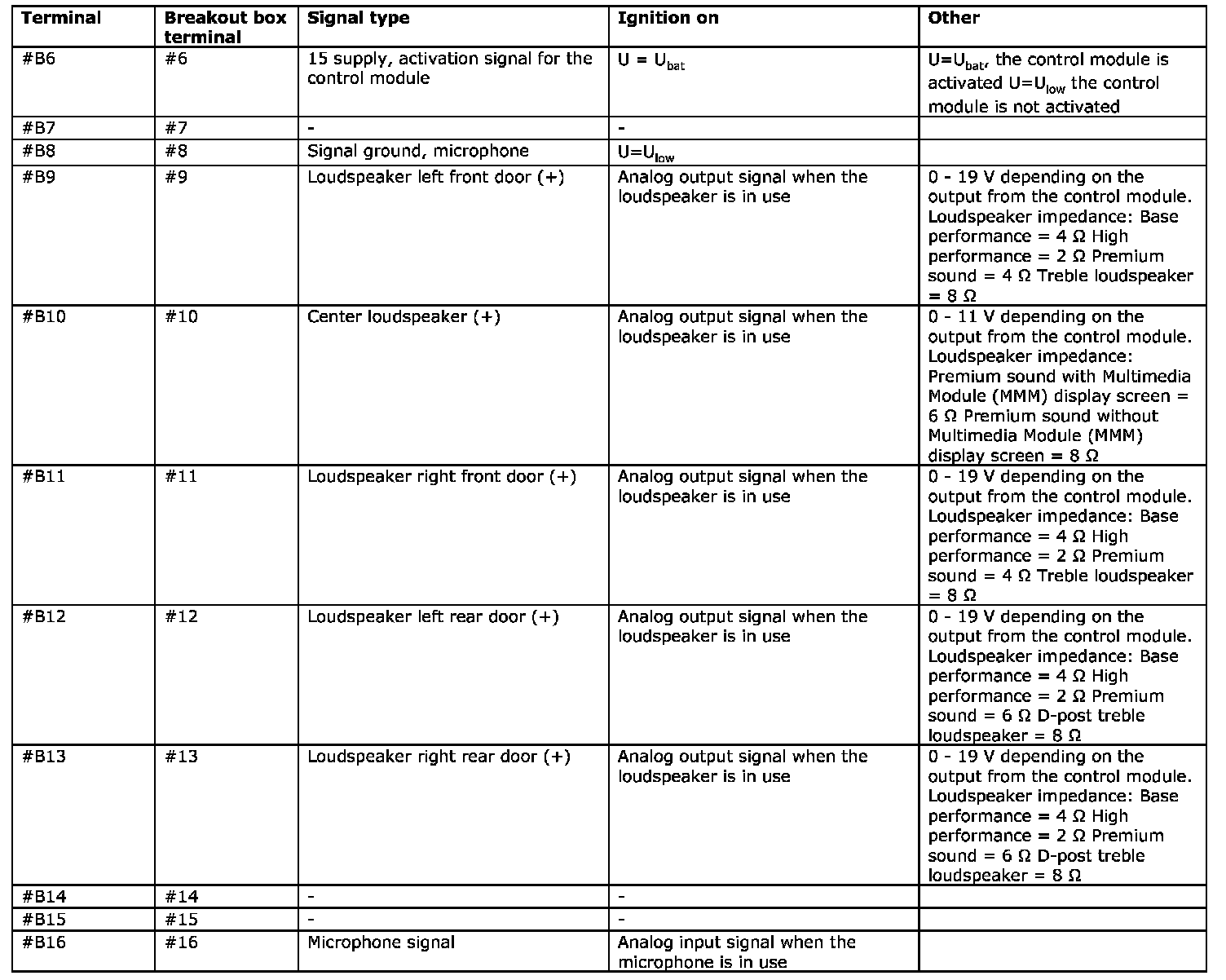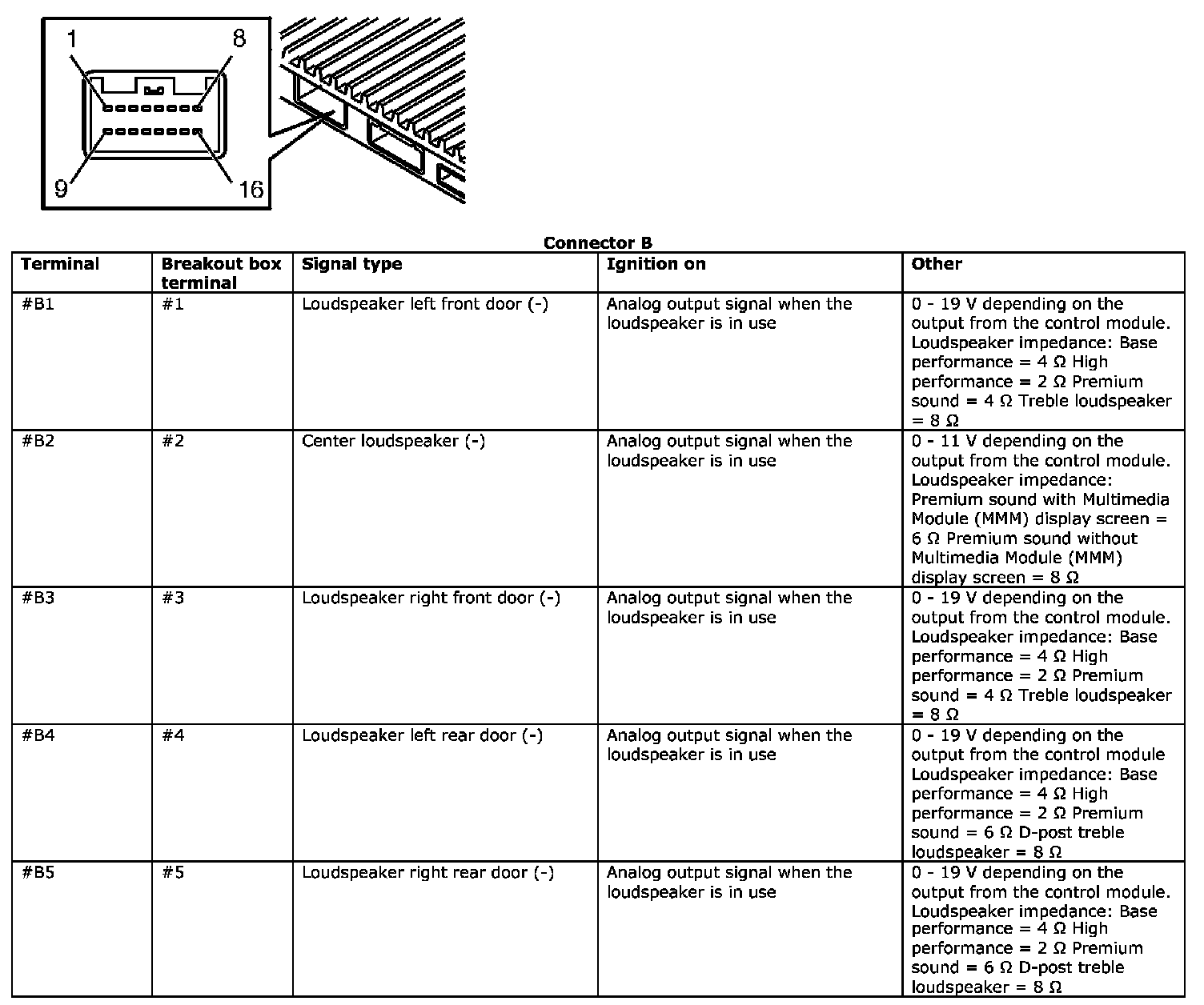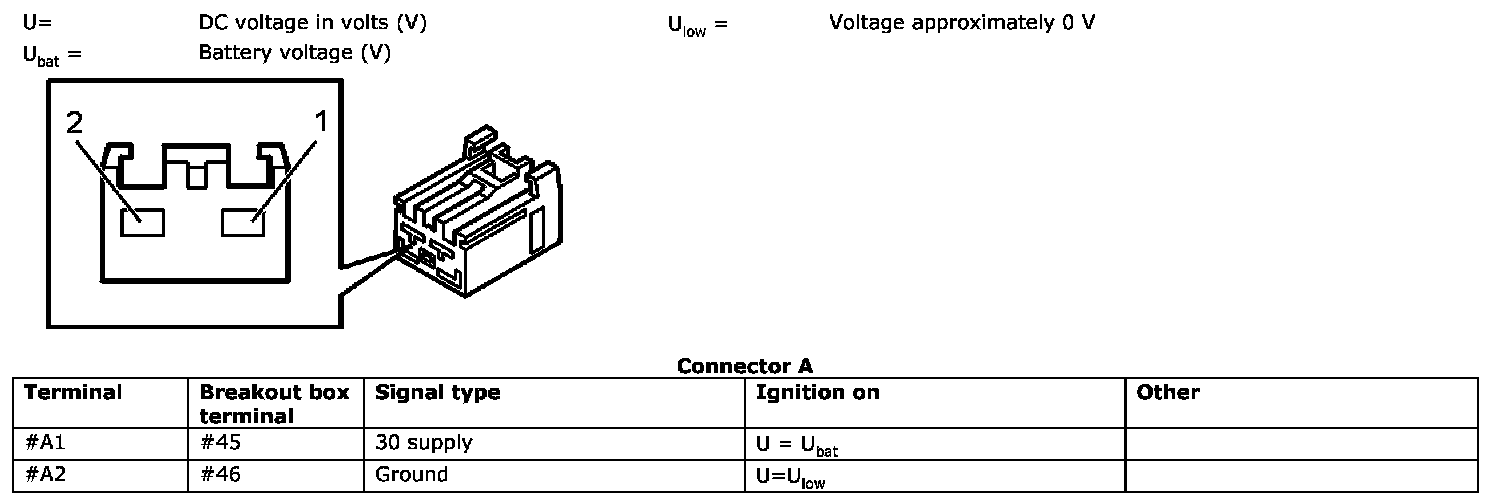 All the values given below are between the respective terminal in column 1 and terminal #A2 in column 2 (power ground) unless otherwise stated in brackets after the table entry.