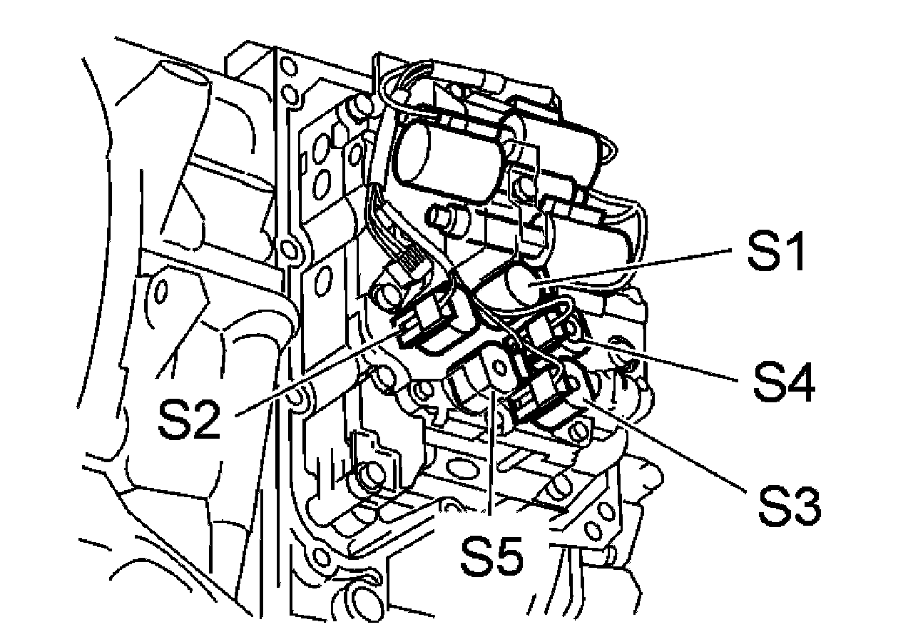 The shift solenoids S1, S2, S3, S4 and S5 are positioned in the valve body in the transmission control system, which is mounted on the front edge of the transmission. The shift solenoids (on/off type), consist of an electrical coil which controls a hydraulic valve. The solenoids are supplied with 12 V via the transmission control module (TCM). and grounded in the control system. The shift solenoids control shifting. The transmission control module (TCM). determines which gear is to be used by activating them in different patterns. There is a diagnostic for the shift solenoids.