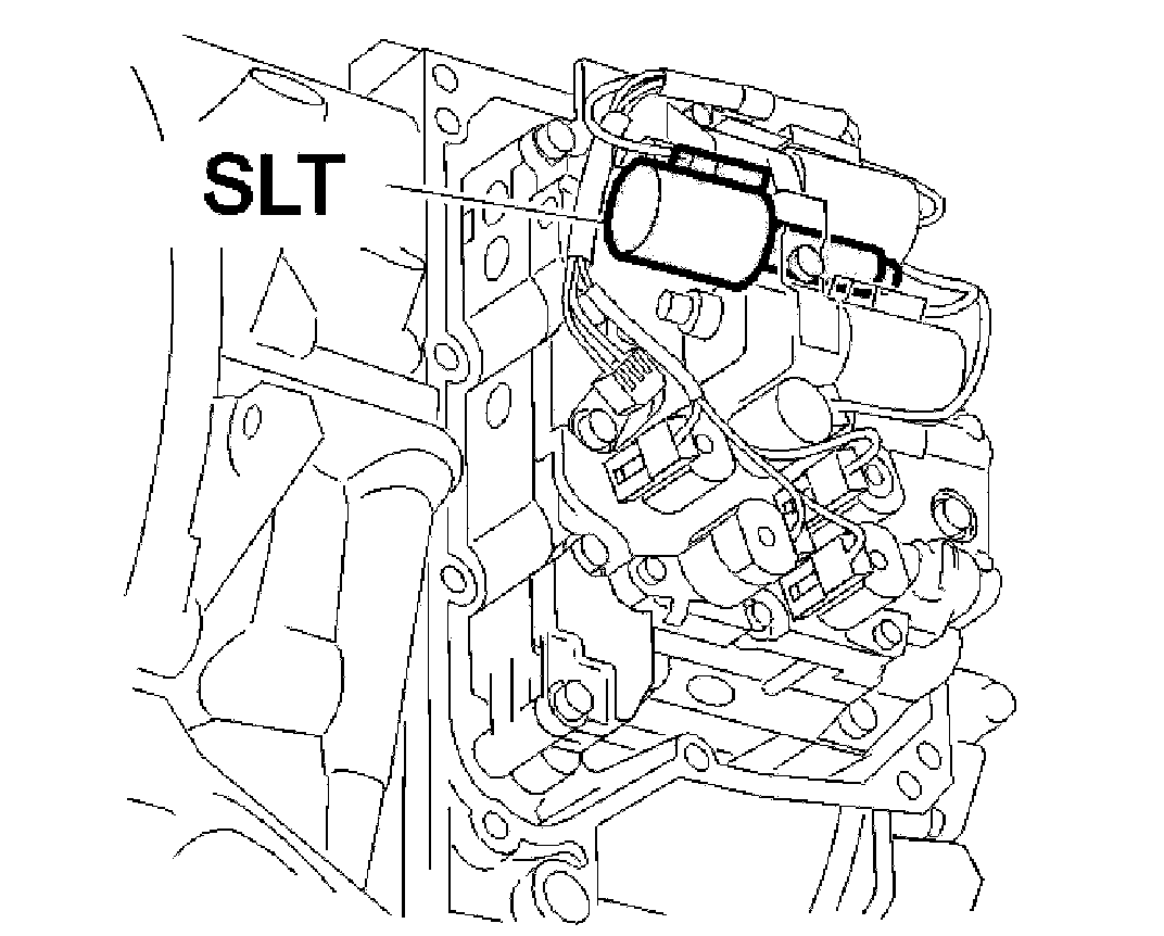 The line pressure solenoid, SLT, is in the transmission control system. This is on the front edge of the transmission. The line pressure solenoid, SLT, consists of an electrical coil which controls a hydraulic valve. The solenoid is controlled by pulse width modulation (PWM) voltage. The solenoid is grounded via the transmission control module (TCM). The hydraulic function of the solenoid is linear. The hydraulic valve is controlled by the varied current which is the result of the pulse conditions. During high pulse conditions, (at high currents (approximately 1 A)) the line pressure is low. During low pulse conditions (at low currents) the line pressure is high. In the event of an open-circuit the line pressure reaches maximum which causes hard shifting. The hydraulic valve is then completely open. There are diagnostics for the solenoid.