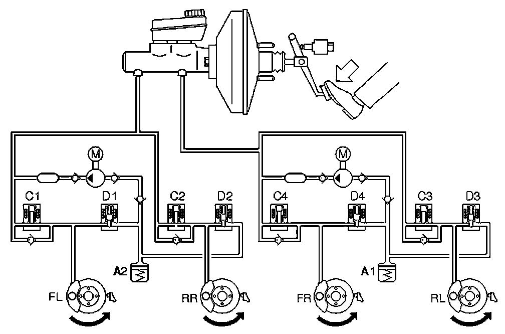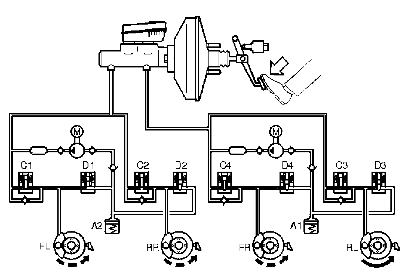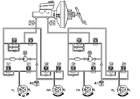 If the wheel locks anyway, the outlet valve opens and the brake fluid is allowed back to the accumulators resulting in a reduction in the brake circuit pressure (pressure release, see the left front wheel - FL). This reduces the hydraulic pressure and braking effect, allowing the wheel to accelerate. The hydraulic pump returns the brake fluid from the accumulators to the master cylinder.