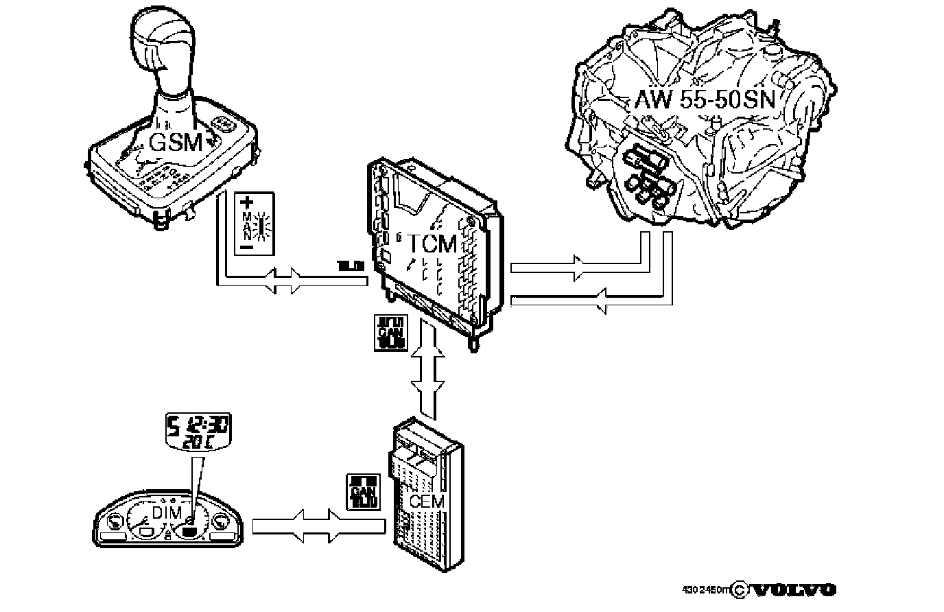 - MAN Manual shifting. There are three hall sensors on the Gear Selector Module (GSM). A permanent magnet on the gear selector lever affects the output signals of the sensors to the Gear Selector Module (GSM).