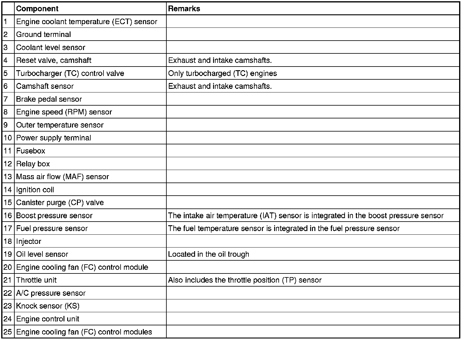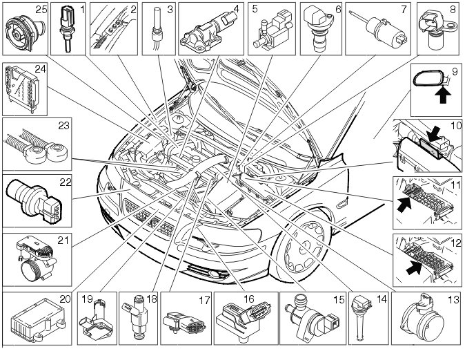 Not all the following components are necessarily in the car. The components vary between engine types.