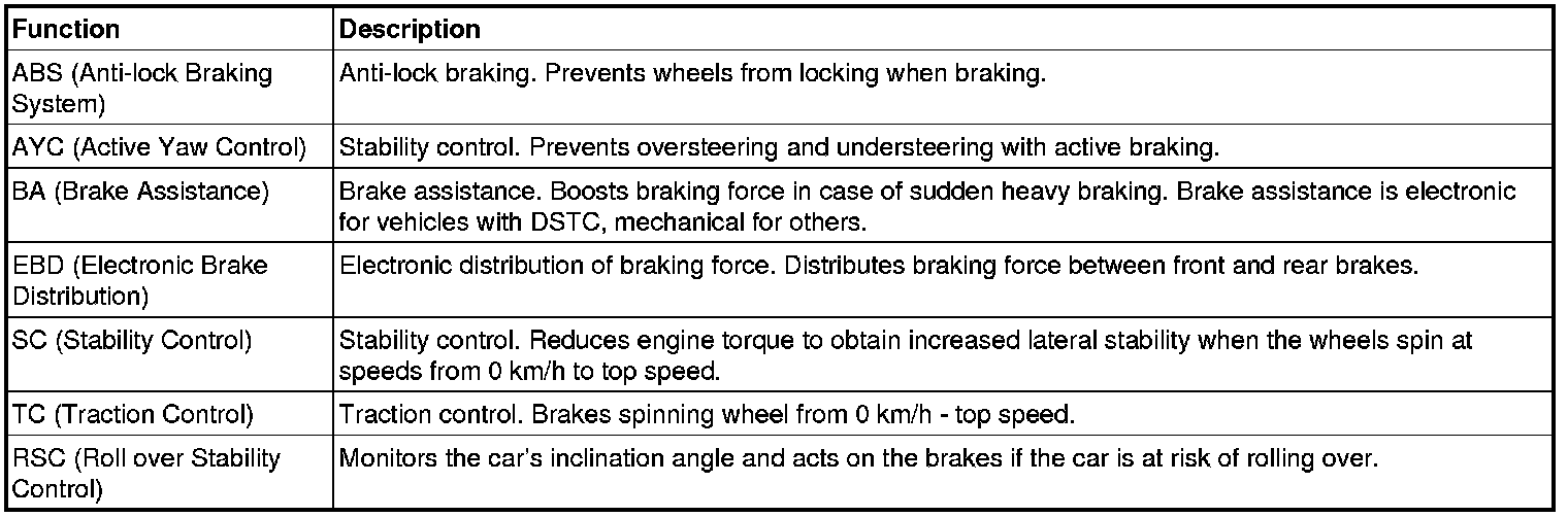 Note! All functions below are not available in all vehicles or vehicle models. The brake system can consist of only ABS or ABS including TRACS, STC, or DSTC.