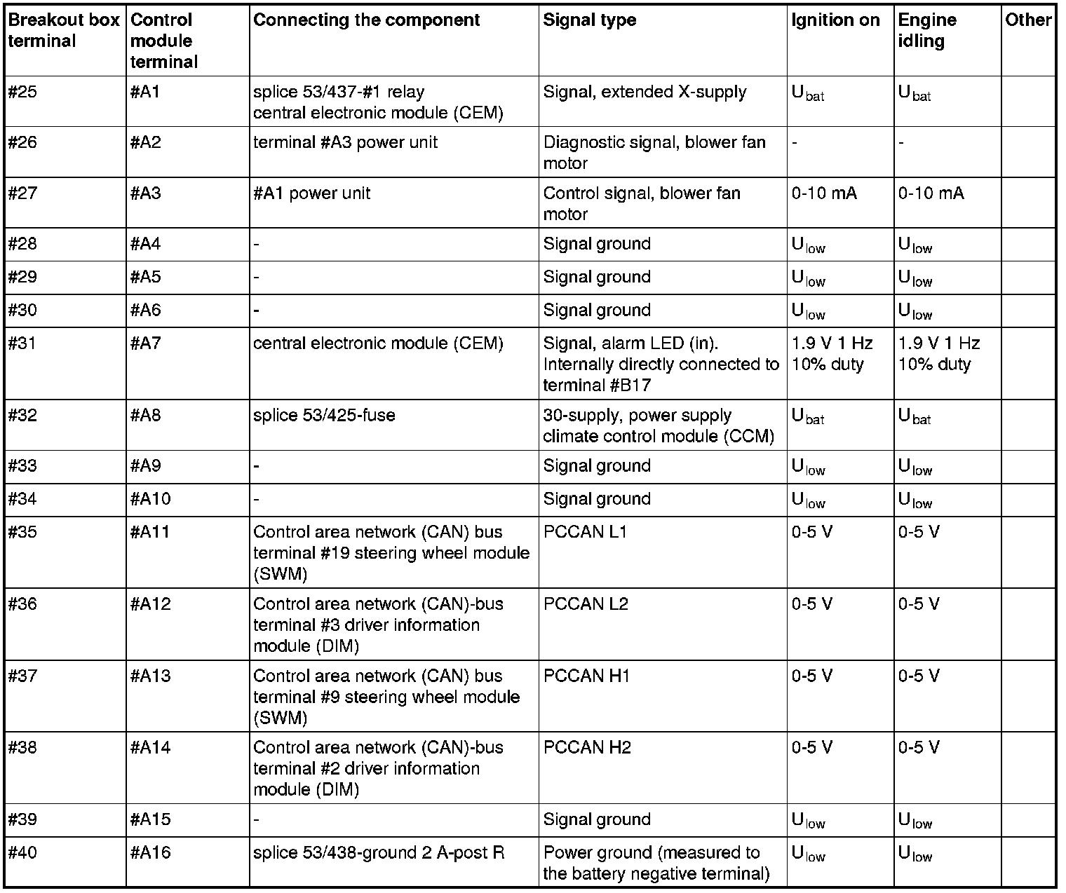 Signal description, climate control module (CCM), Connector A