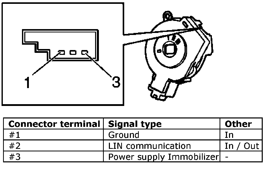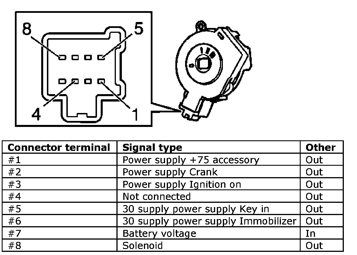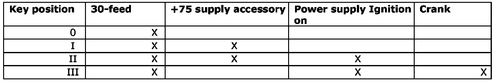 With loose Start control module (SCU): Measure the resistance between the control module pins in the different key positions. Compare the result with the table that describes in which position each voltage supply is active. Open switches have a resistance of at least 100 m ohms. Closed switches have a resistance of a maximum of 100 m ohms.