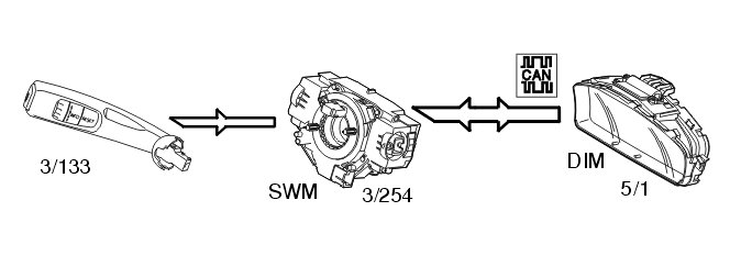 The left-hand control stalk (3/133) is used to control the trip computer and to display and erase text messages in the driver information module (DIM) (5/1). The steering wheel module (SWM) (3/254) transmits information to the driver information module (DIM) (5/1) on the controller area network (CAN) indicating which function is selected.