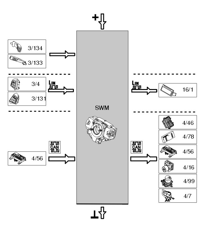 The Steering wheel module (SWM) communicates with directly connected components (steering wheel buttons) via LIN communication.