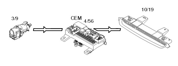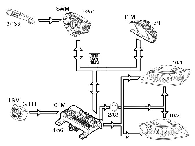 This function is controlled by the left control stalk (3/133). The steering wheel module (SWM) (3/254) sends signals via the control area network (CAN) to the central electronic module (CEM) (4/56) to activate the turn signal lamps (10/13-14 and 10/47-54).