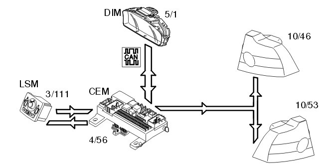The rear fog lamps (10/46, 10/53) are activated by pressing the button for the rear fog lamps in the lamp switch module (3/111). The light switch module (LSM) is directly connected to the central electronic module (CEM) (4/56). The central electronic module (CEM) directly powers the lamps via an output.