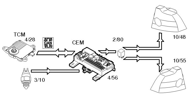 The back-up lamps (10/48, 10/55) are activated when back-up gear is selected. The transmission control module (TCM) (4/28) transmits information via the Control area network (CAN) to the central electronic module (CEM) (4/56) indicating that back-up (reverse) gear is selected. The central electronic module (CEM) activates the relay (2/80) and the back-up (reversing) lamps are supplied with power via the relay.