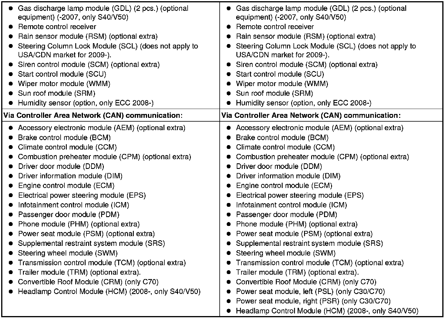 The table below summarizes the input signals to and output signals from the central electronic module (CEM). The signal types are divided into directly connected signals, serial communication and controller area network (CAN) communication.