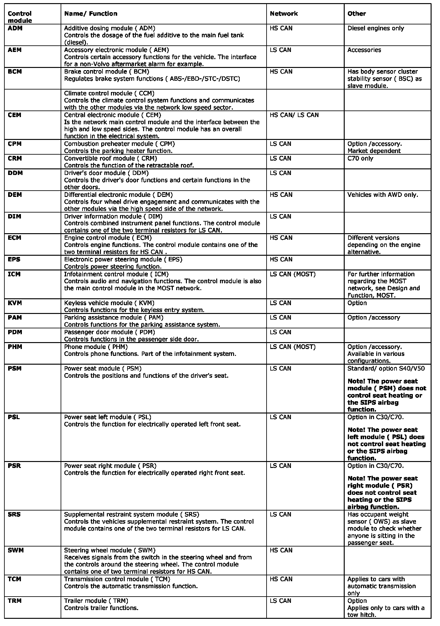 HS CAN = CAN High speed section (500 kbit/s). Contains the control modules located in the engine compartment.