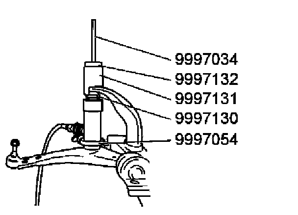 Press the control arm into place. Install the hydraulic cylinder. Use: 999 7054 with: 999 7034, nut M12: 999 7132, socket: 999 7131 and drift: 999 7130. Pull the bushing out.